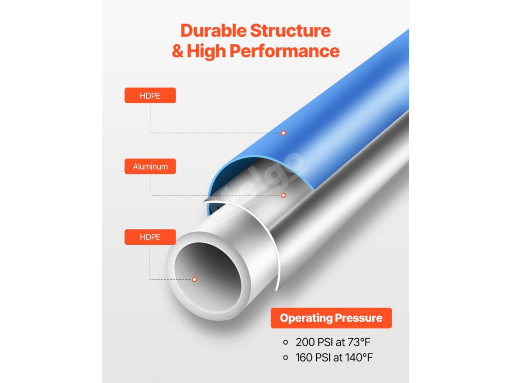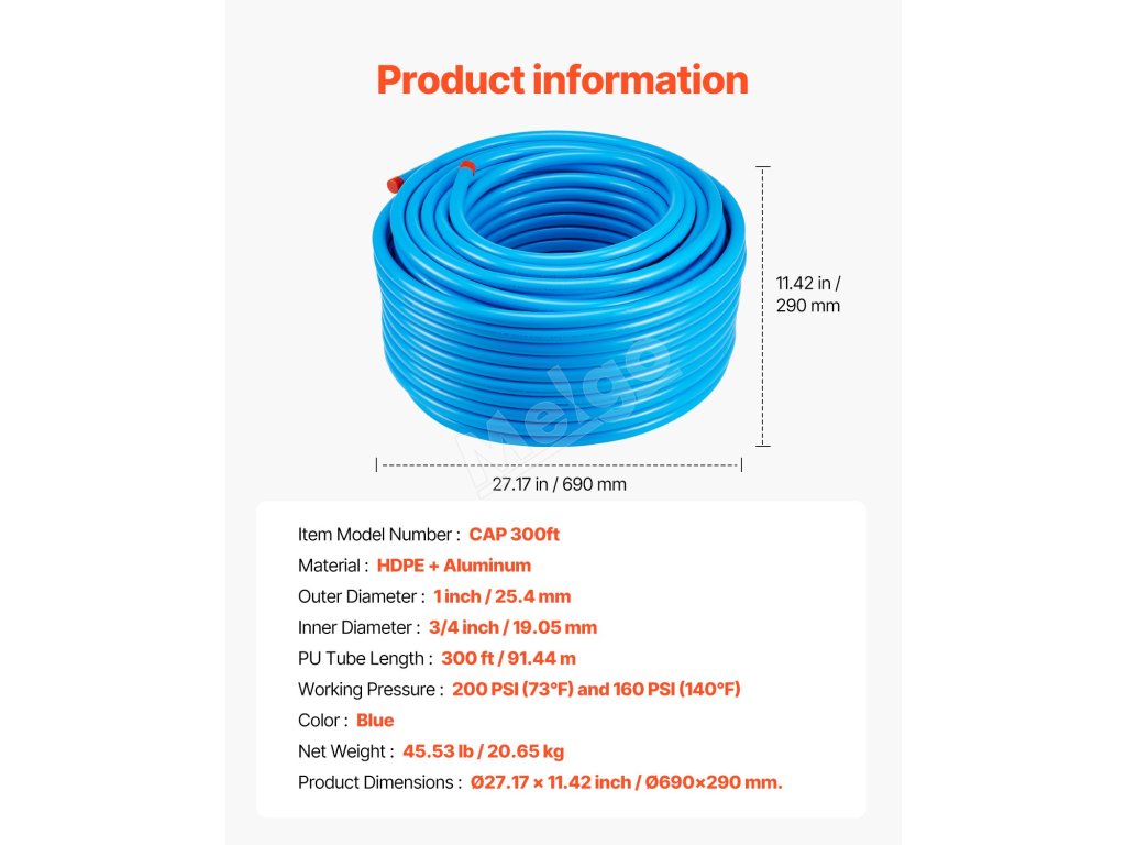 Náš 300FT x 3/4" potrubný systém stlačeného vzduchu má trojvrstvovú štruktúru HDPE-hliník-HDPE, ktorá zaručuje vynikajúcu odolnosť proti korózii, odolnosť proti vysokému tlaku a vynikajúcu pevnosť. Nepriepustný a ľahko sa inštaluje, poskytuje spoľahlivé a efektívne zásobovanie vzduchom pre továrne a dielne.