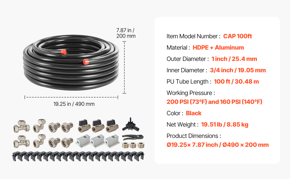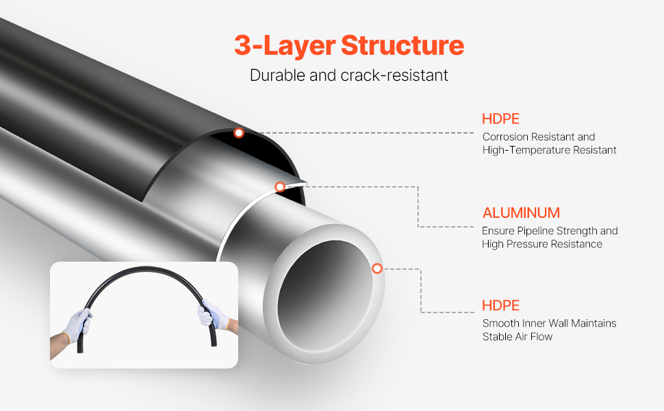 Náš 100FT x 3/4" potrubný systém stlačeného vzduchu má trojvrstvovú štruktúru HDPE-hliník-HDPE, ktorá zaručuje vynikajúcu odolnosť proti korózii, odolnosť proti vysokému tlaku a vynikajúcu pevnosť. Nepriepustný a ľahko sa inštaluje, poskytuje spoľahlivé a efektívne zásobovanie vzduchom pre továrne a dielne.