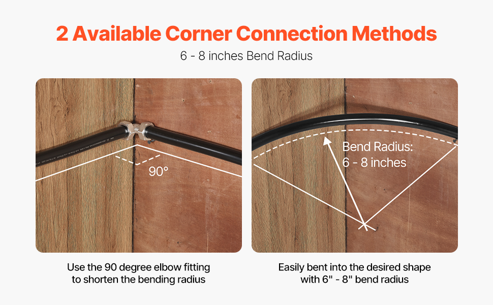 Tento systém potrubia na stlačený vzduch ponúka 2 flexibilné rohové spôsoby pripojenia. Môžete si vybrať 90-stupňovú kolenovú tvarovku na pravouhlé pripojenie, ktorá znižuje polomer ohybu, alebo sa rozhodnúť pre metódu polomerového ohybu, ktorá sa ľahko prispôsobí požadovanému tvaru s polomerom ohybu 6 až 8 palcov.