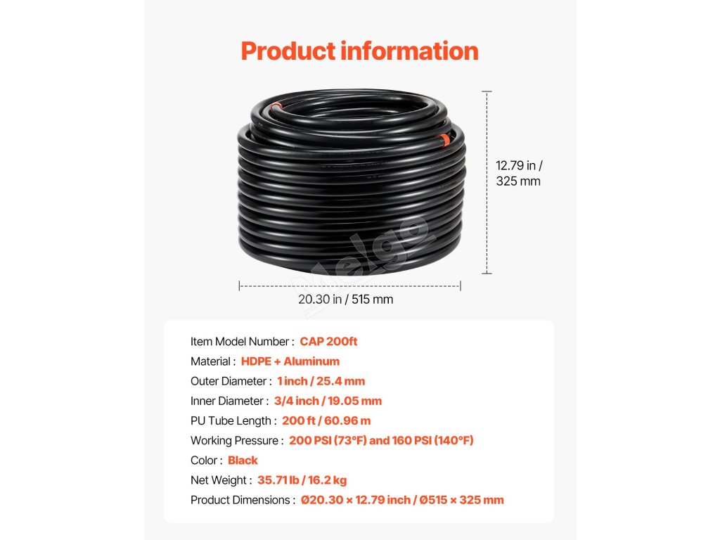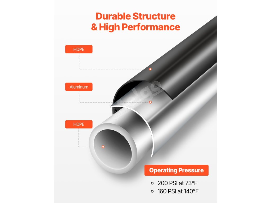 Náš 200FT x 3/4" potrubný systém stlačeného vzduchu má trojvrstvovú štruktúru HDPE-hliník-HDPE, ktorá zaručuje vynikajúcu odolnosť proti korózii, odolnosť proti vysokému tlaku a vynikajúcu pevnosť. Nepriepustný a ľahko sa inštaluje, poskytuje spoľahlivé a efektívne zásobovanie vzduchom pre továrne a dielne.