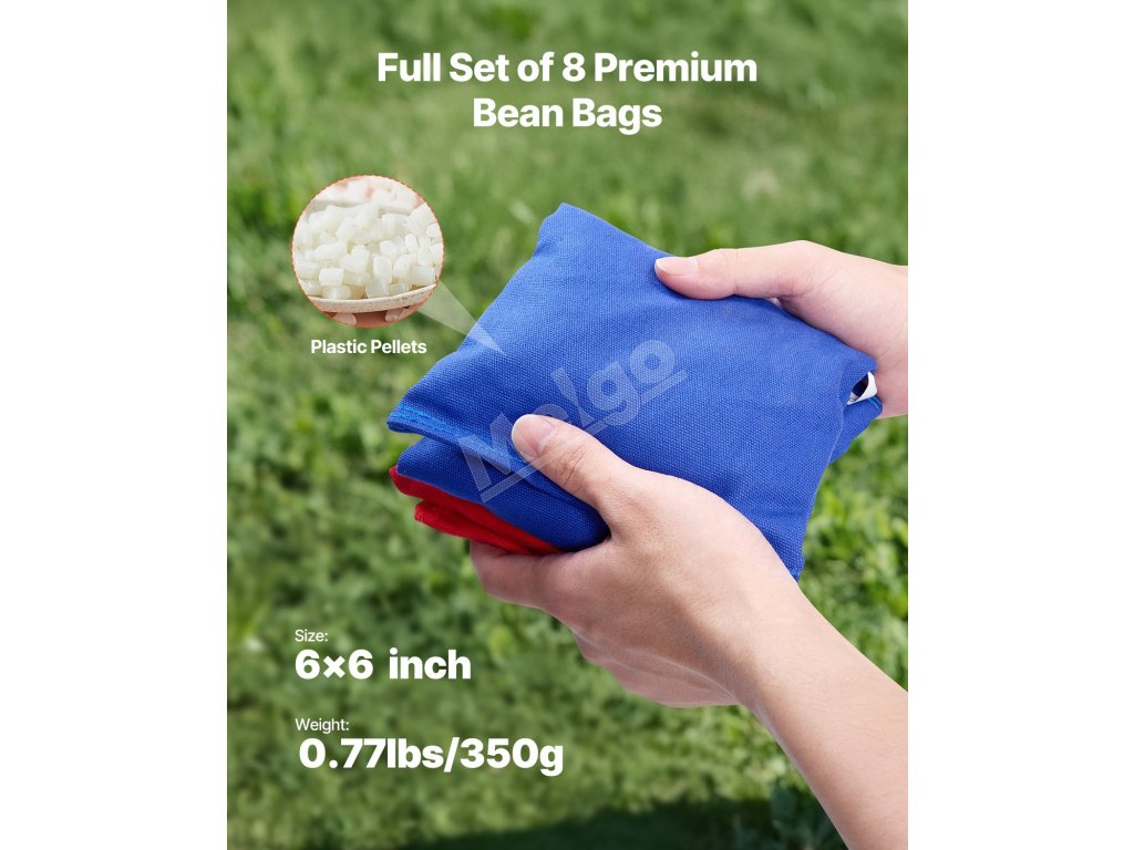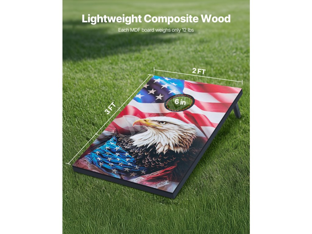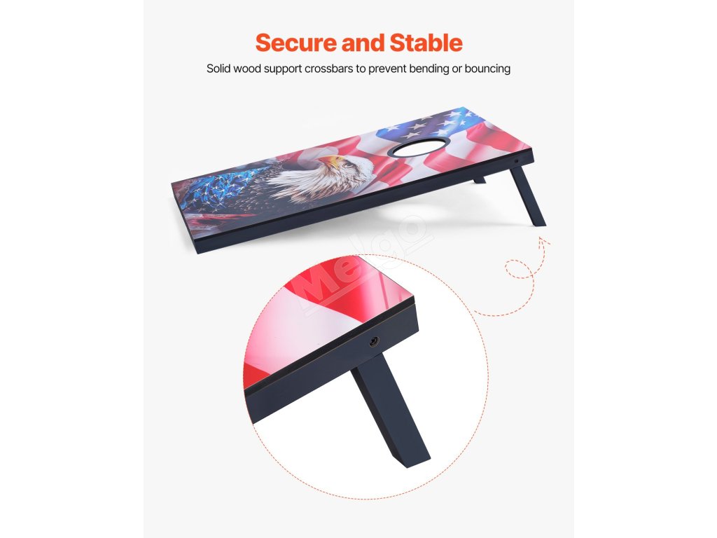 Súprava na hru corn hole má rám a vrchnú dosku z masívneho dreva, ktoré sú navzájom zabezpečené pomocou skosených spojov a odolného hardvéru, vďaka čomu je hracia doska odolná a odolná voči deformácii alebo praskaniu.