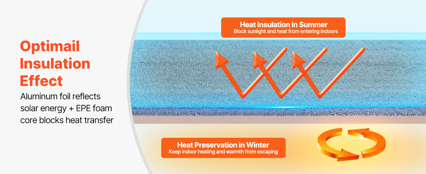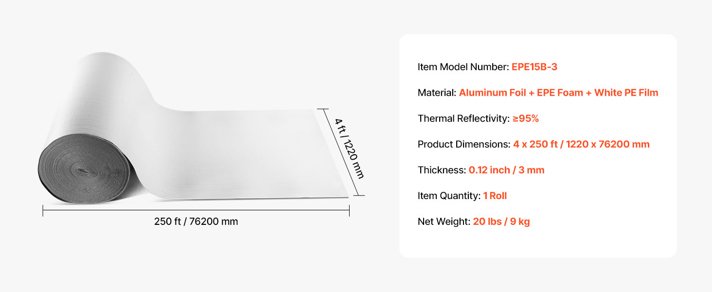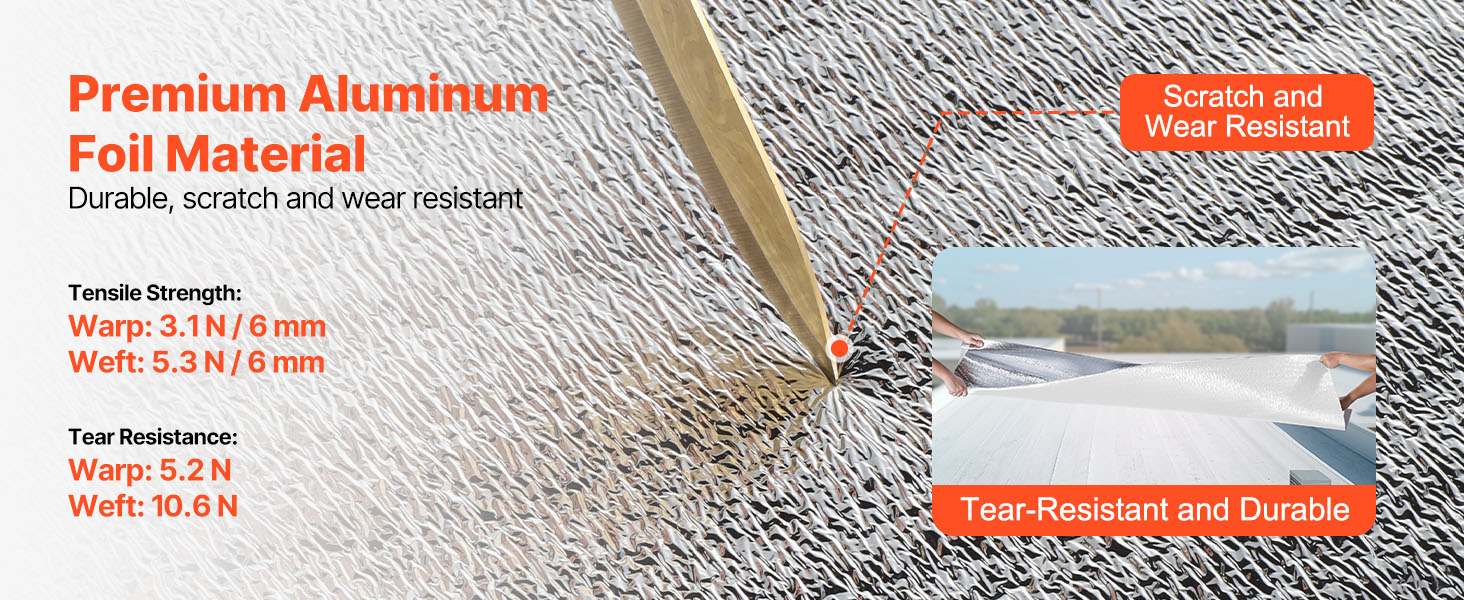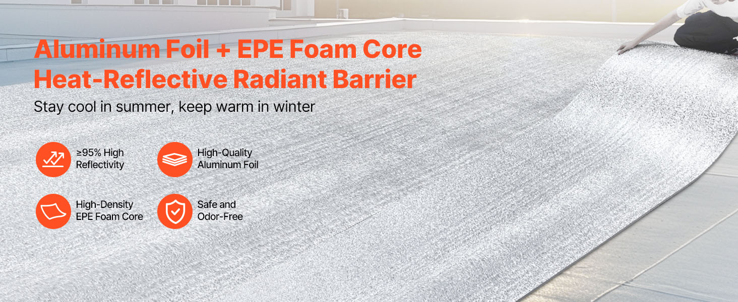 Reflexná izolačná rolka VEVOR má ≥ 95 % vysokú odrazivosť, je vyrobená z reflexnej hliníkovej fólie, penového jadra EPE a bielej PE fólie. V lete blokuje slnečné žiarenie a v zime zabraňuje stratám tepla v interiéri, čím udržiava príjemnú teplotu v interiéri.