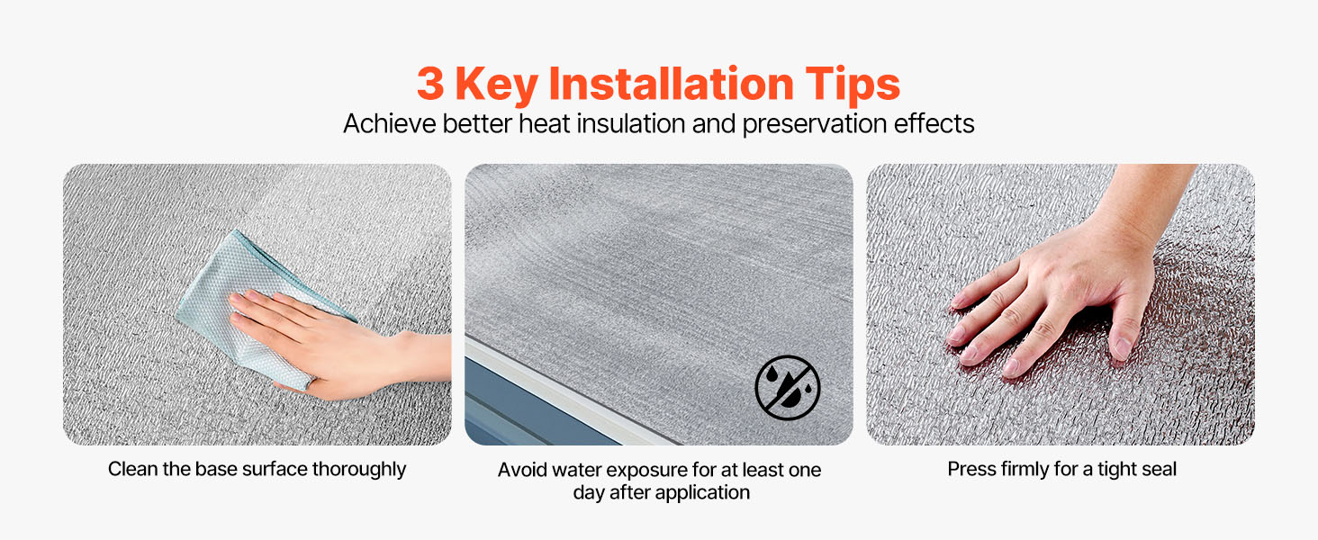 Aby ste maximalizovali účinnosť tepelnej izolácie, dodržiavajte 3 tipy na inštaláciu: udržiavajte čistý a suchý podkladový povrch, zabráňte pôsobeniu vody aspoň jeden deň po aplikácii a pevne pritlačte, aby ste dosiahli tesné utesnenie a optimálny izolačný výkon.