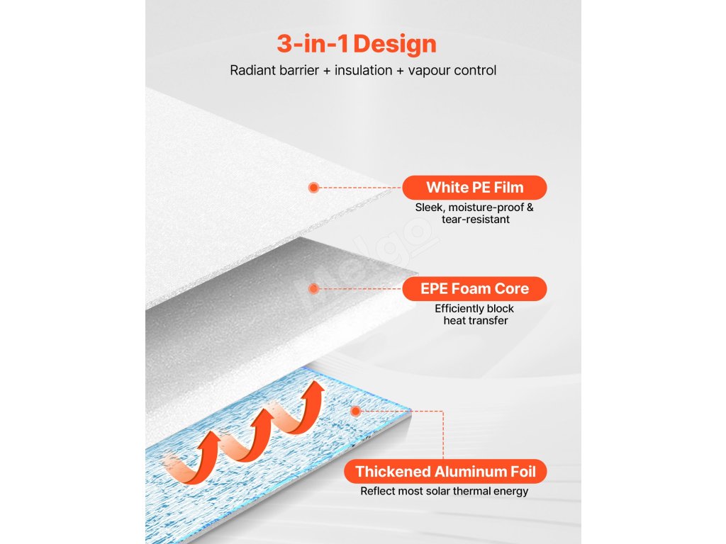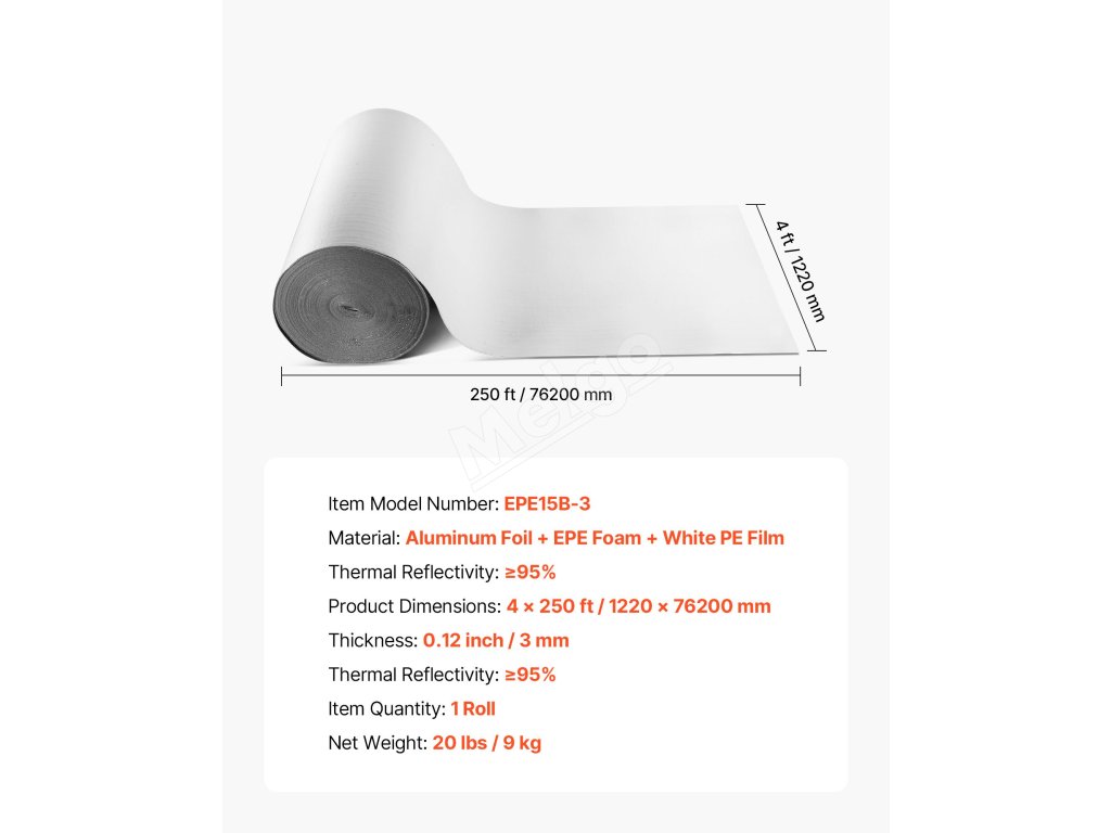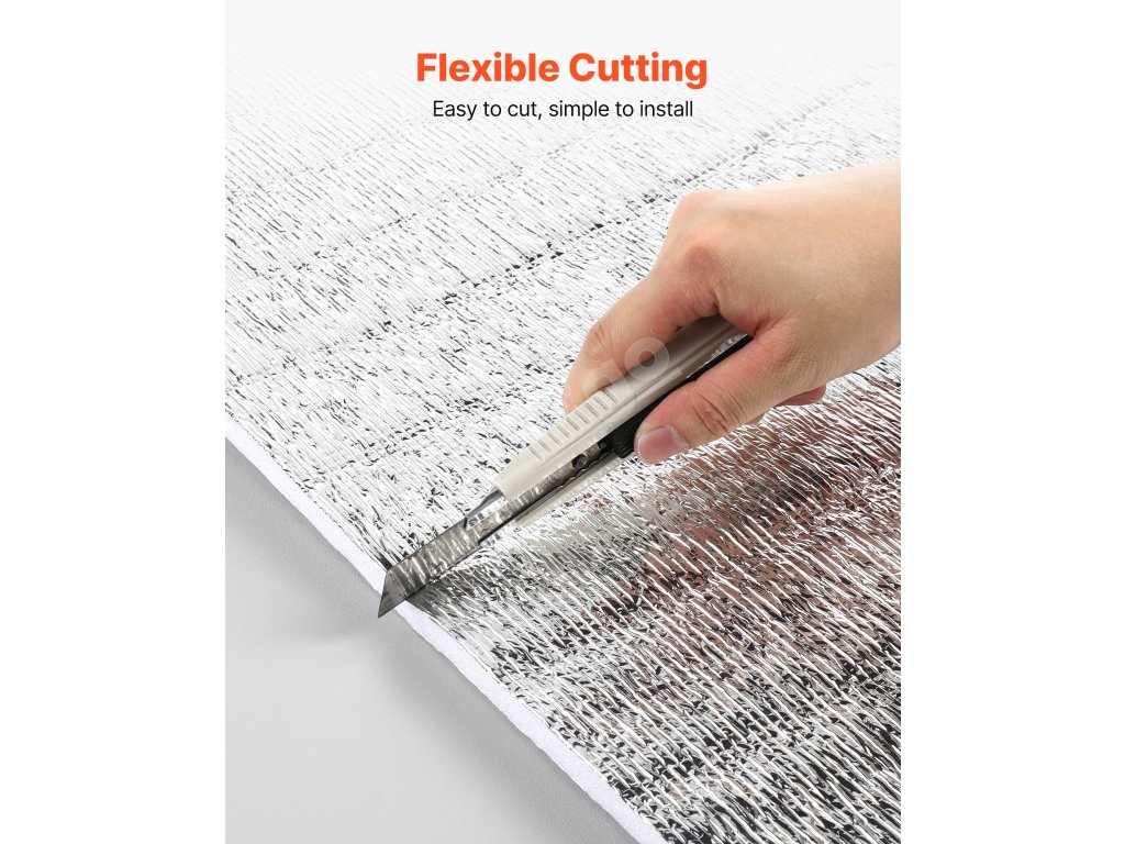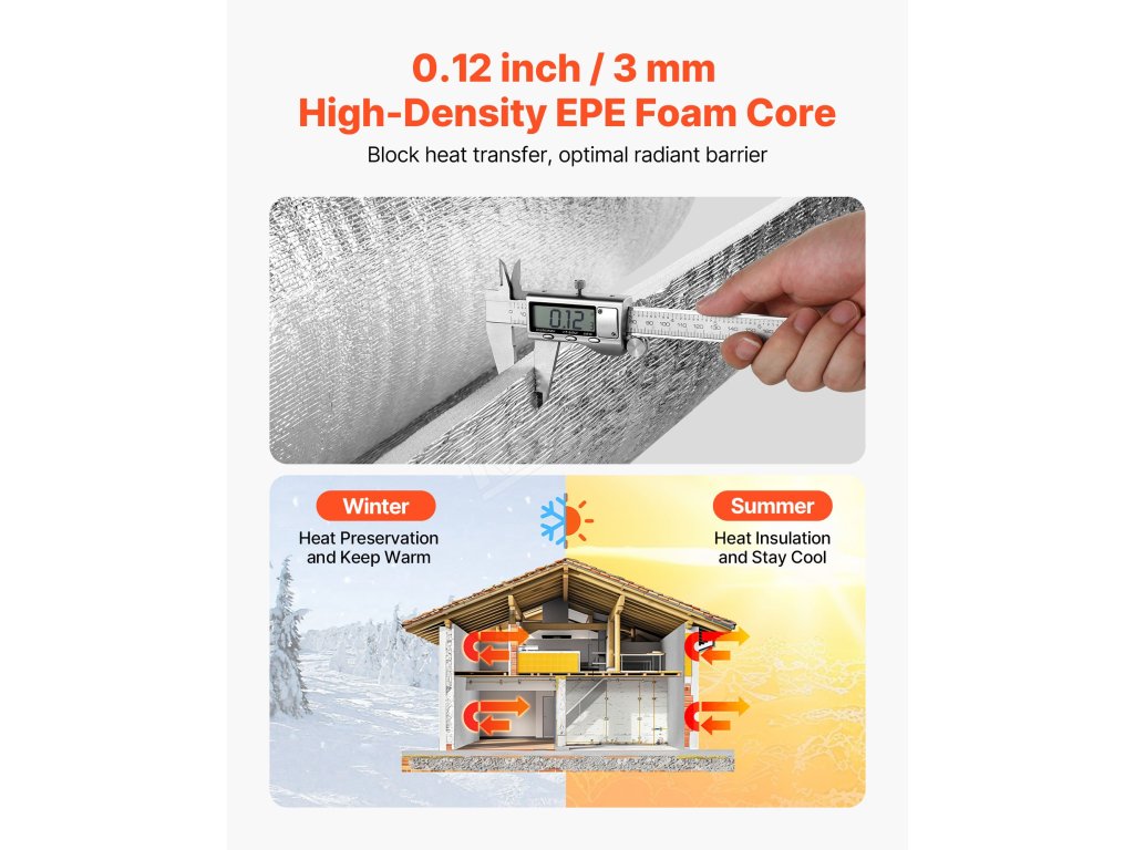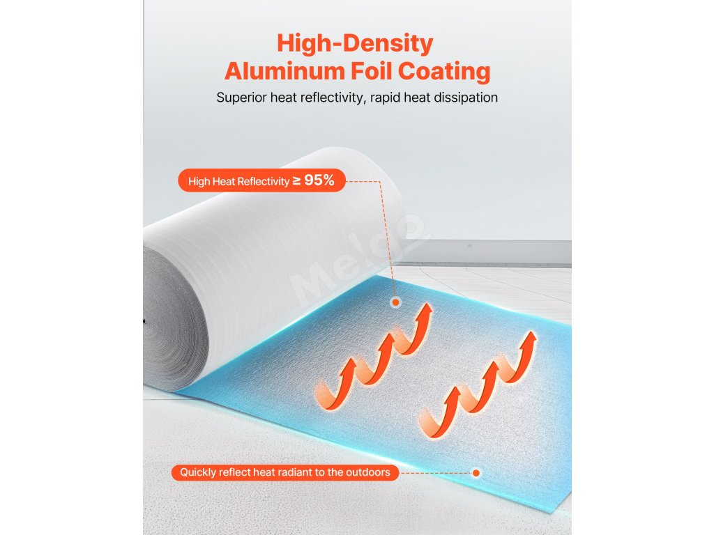 Reflexná izolačná rolka VEVOR má ≥ 95 % vysokú odrazivosť, je vyrobená z reflexnej hliníkovej fólie, penového jadra EPE a bielej PE fólie. V lete blokuje slnečné žiarenie a v zime zabraňuje stratám tepla v interiéri, čím udržiava príjemnú teplotu v interiéri.