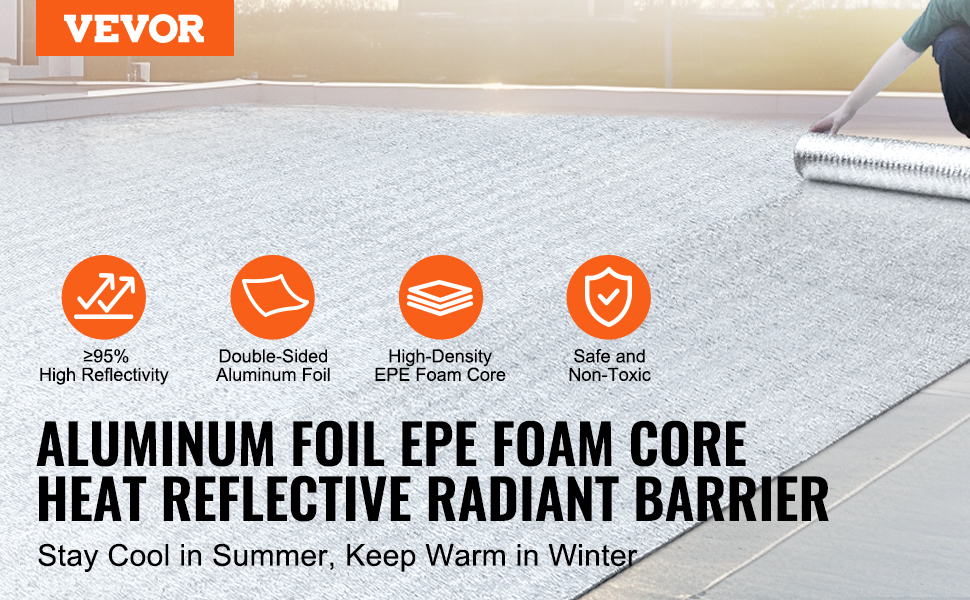 Dvojitá reflexná izolačná rolka VEVOR sa vyznačuje ≥ 95 % vysokou odrazivosťou, pričom využíva dvojitú reflexnú hliníkovú fóliu a penové jadro EPE s vysokou hustotou. V lete účinne blokuje slnečné žiarenie a v zime zabraňuje stratám tepla v interiéri, čím udržiava príjemnú teplotu v interiéri.