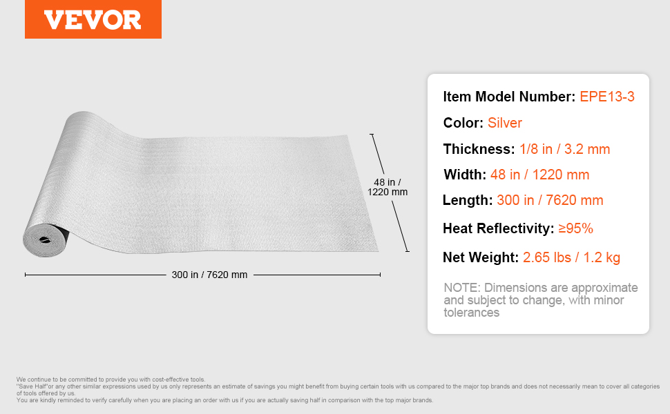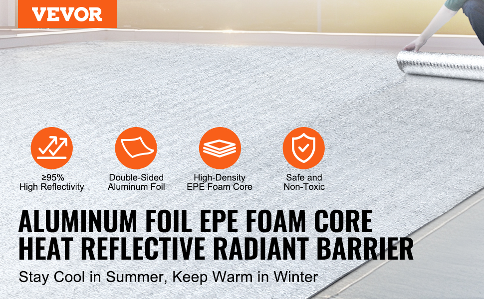 Dvojitá reflexná izolačná rolka VEVOR sa vyznačuje ≥ 95 % vysokou odrazivosťou, pričom využíva dvojitú reflexnú hliníkovú fóliu a penové jadro EPE s vysokou hustotou. V lete účinne blokuje slnečné žiarenie a v zime zabraňuje stratám tepla v interiéri, čím udržiava príjemnú teplotu v interiéri.