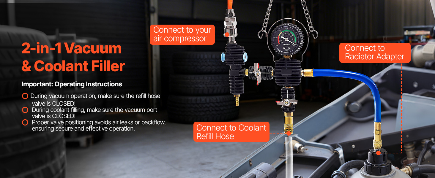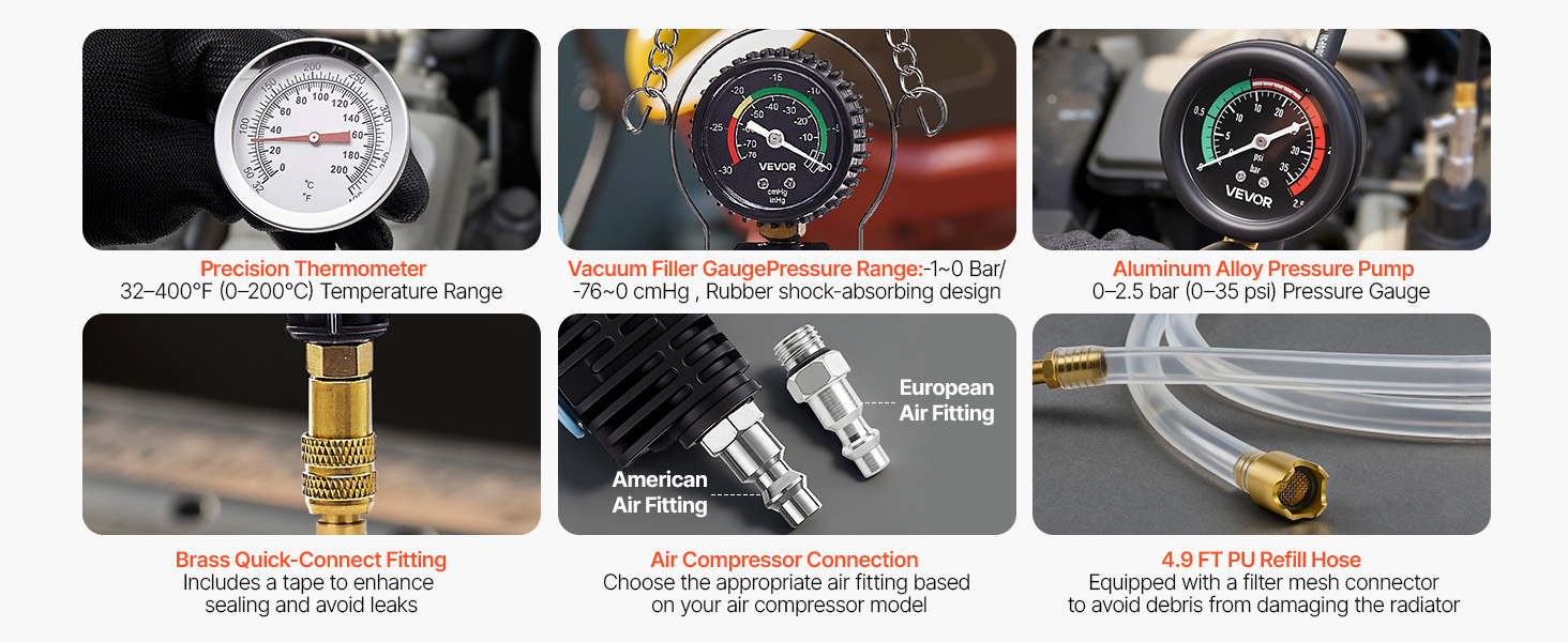 Vykonáva tlakové skúšky, teplotné skúšky, vákuové skúšky a doplňovanie chladiacej kvapaliny v jednej súprave testera tlaku chladiacej kvapaliny. Spolupracuje so vzduchovým kompresorom, čím výrazne zvyšuje účinnosť výmeny. Nie je potrebné opakované odvzdušňovanie, čo šetrí čas a úsilie