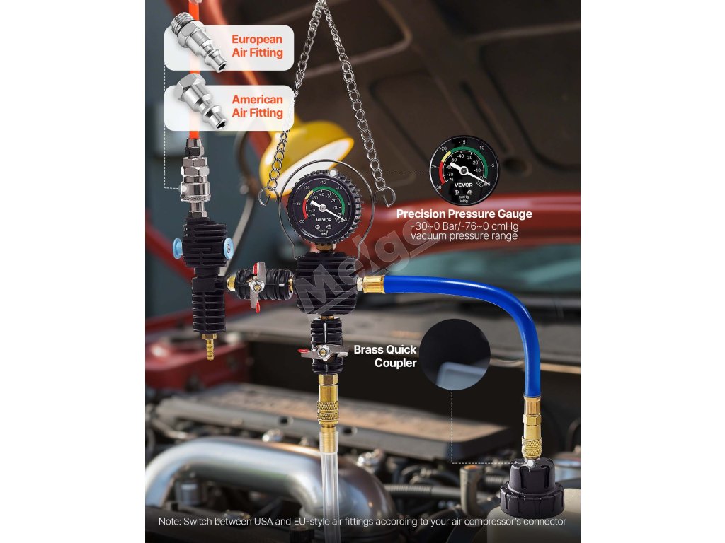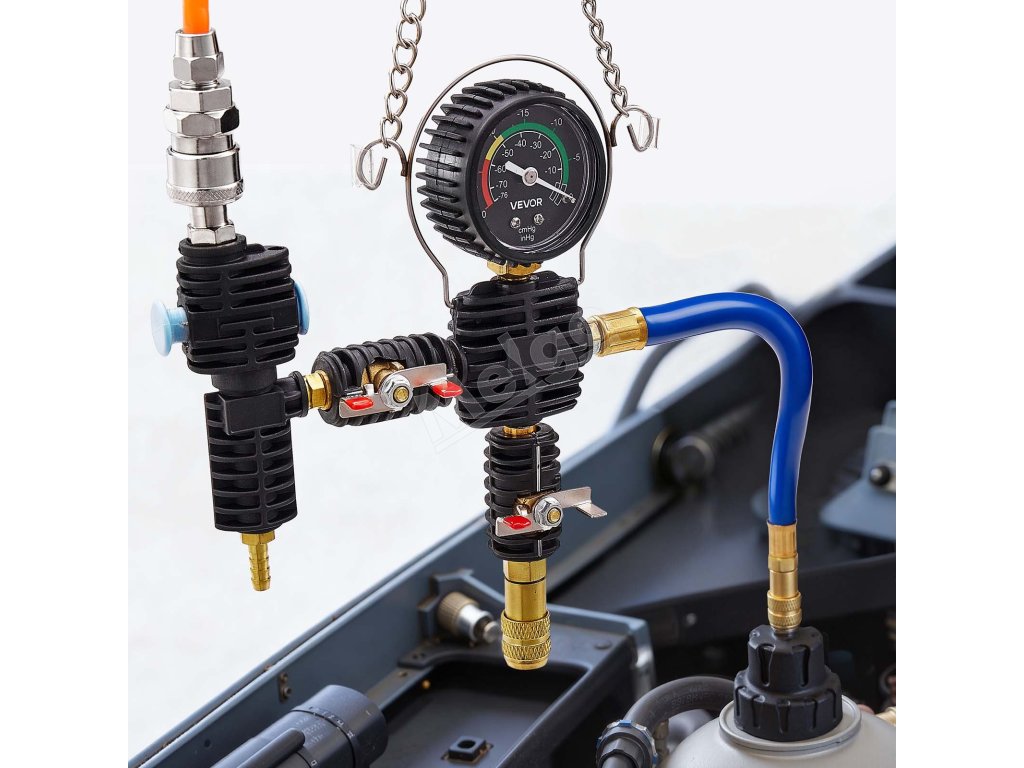 Vykonáva tlakové skúšky, teplotné skúšky, vákuové skúšky a doplňovanie chladiacej kvapaliny v jednej súprave testera tlaku chladiacej kvapaliny. Spolupracuje so vzduchovým kompresorom, čím výrazne zvyšuje účinnosť výmeny. Nie je potrebné opakované odvzdušňovanie, čo šetrí čas a úsilie