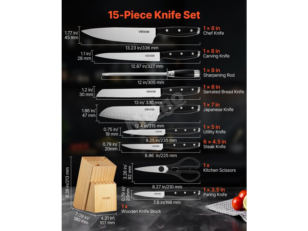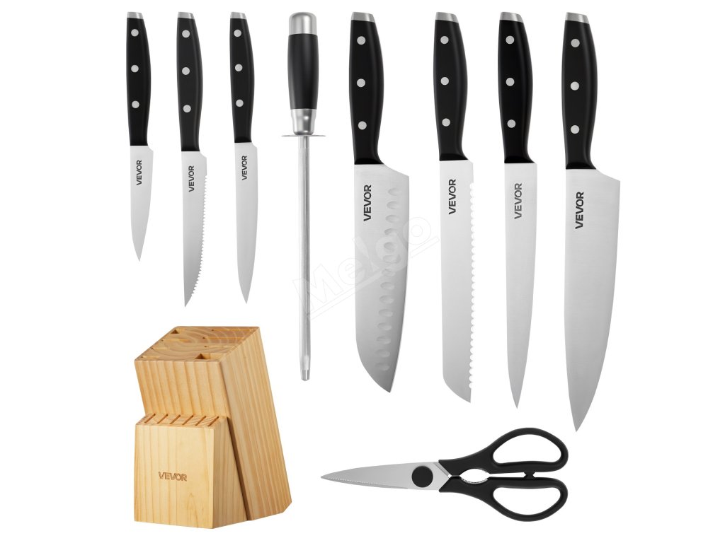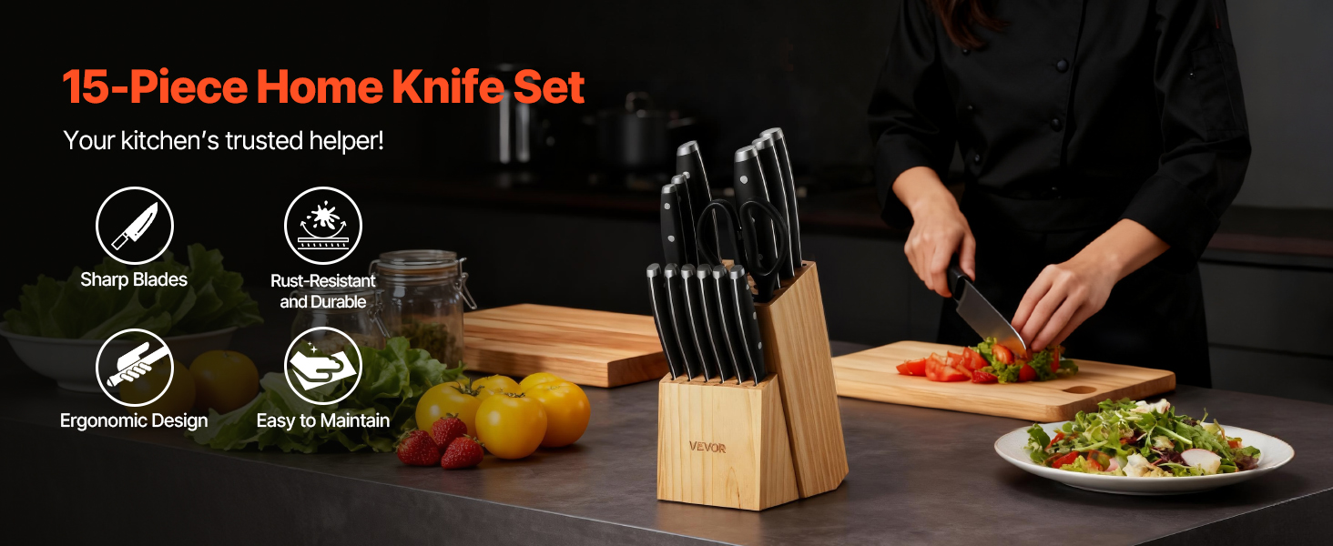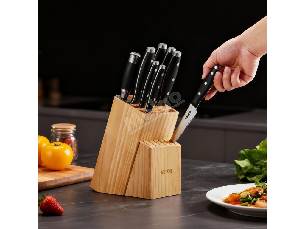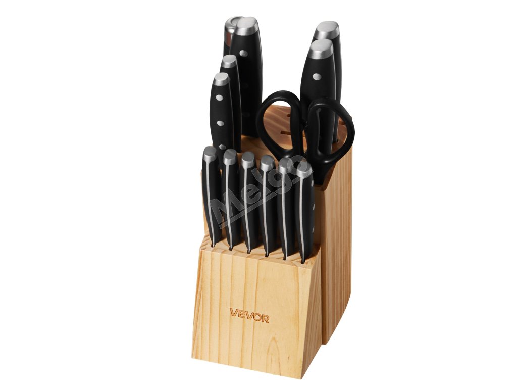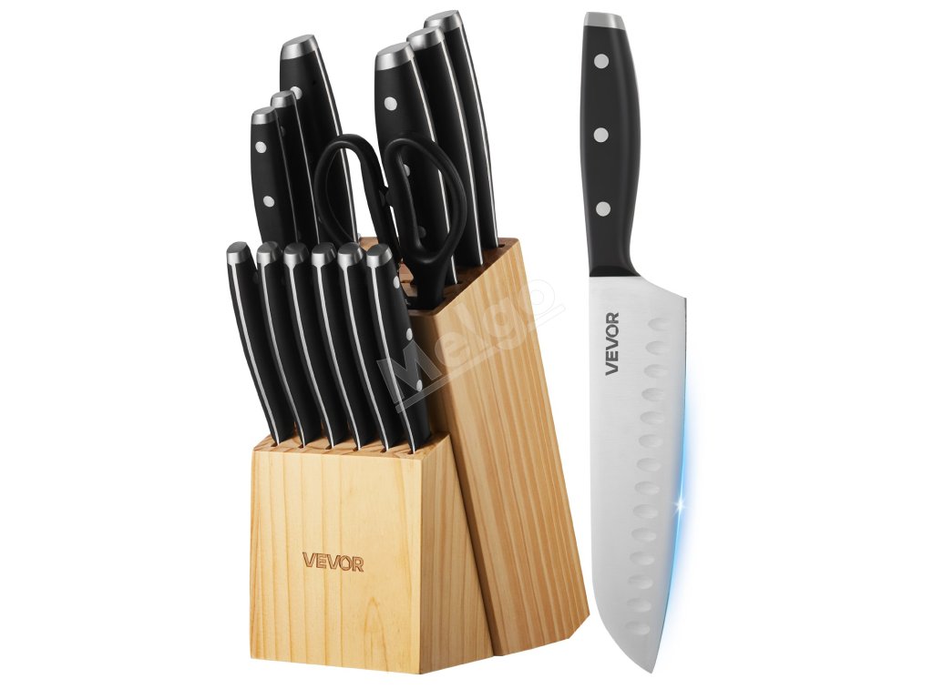 Naša 15-dielna súprava nožov pokryje všetky vaše potreby pri krájaní! Je vyrobená z vysokokarbónovej nehrdzavejúcej ocele s presným ostrením, takže zostáva ostrá a odolná. Ergonomické rukoväte zaisťujú pohodlné držanie a znižujú únavu. Súčasťou je prémiový drevený blok a 8-palcový brúsik na jednoduché skladovanie a údržbu. Vďaka štýlovému dizajnu je skvelým darčekom pre vás alebo vašich blízkych.