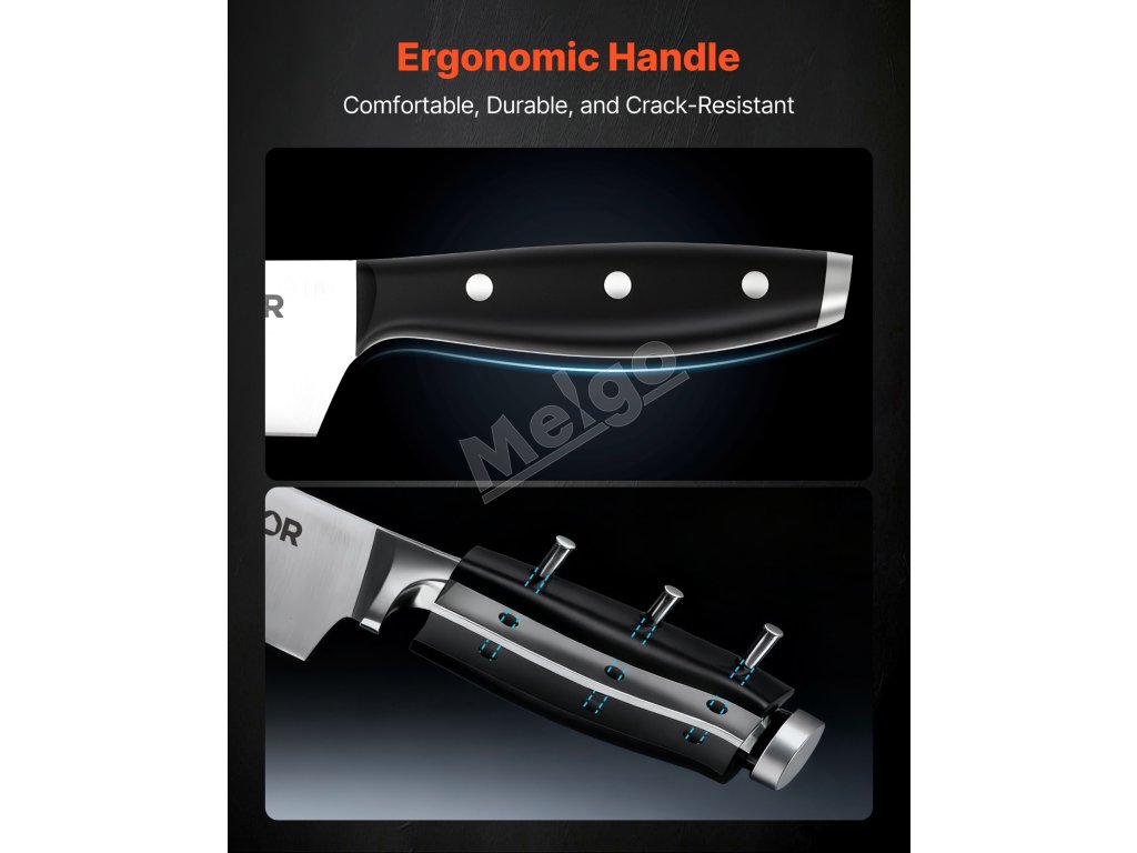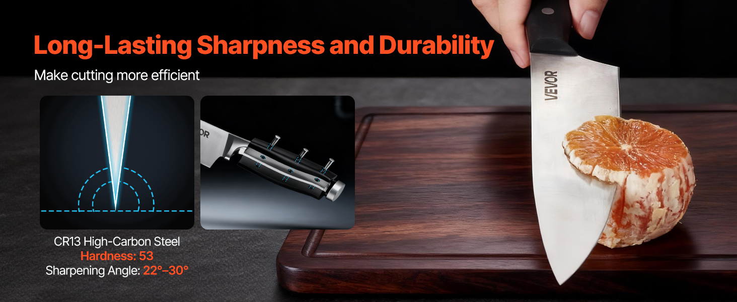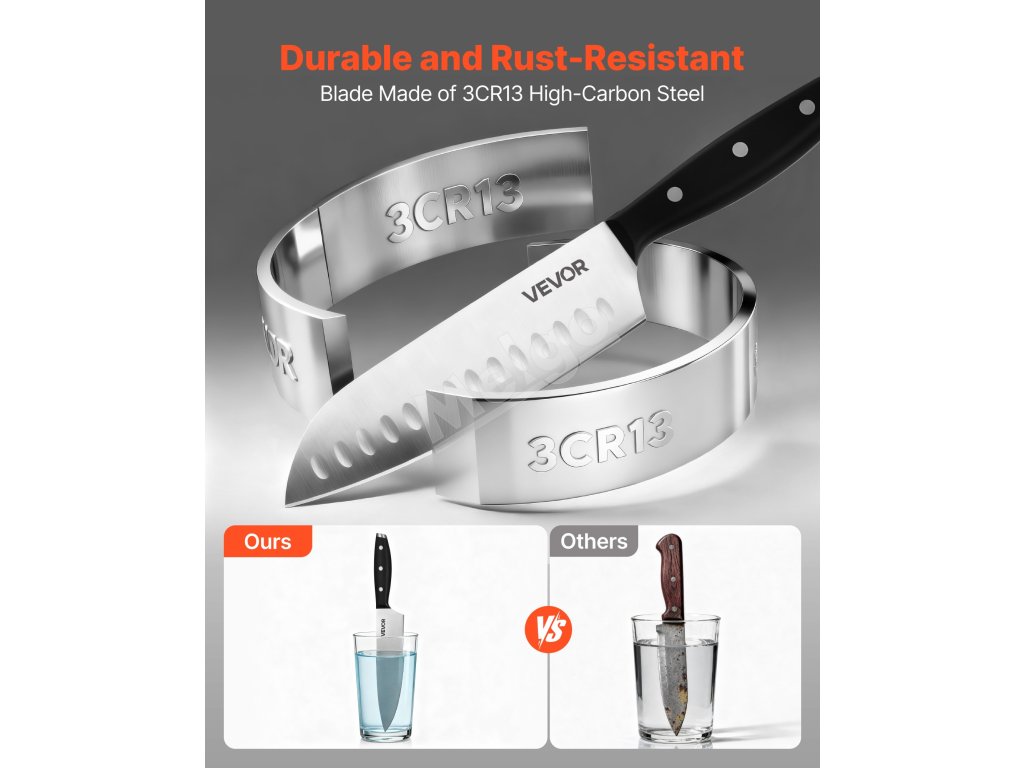 Táto súprava nožov je vyrobená z prvotriednej vysokokarbónovej ocele a ponúka ideálnu rovnováhu medzi tvrdosťou a húževnatosťou, čím si zachováva dlhotrvajúcu ostrosť bez častého ostrenia. Rukoväť je odolná proti prasknutiu a bezpečne pripevnená, čo vám dodá stabilitu a istotu pri každom použití.