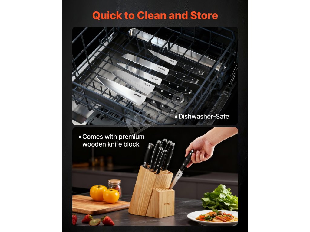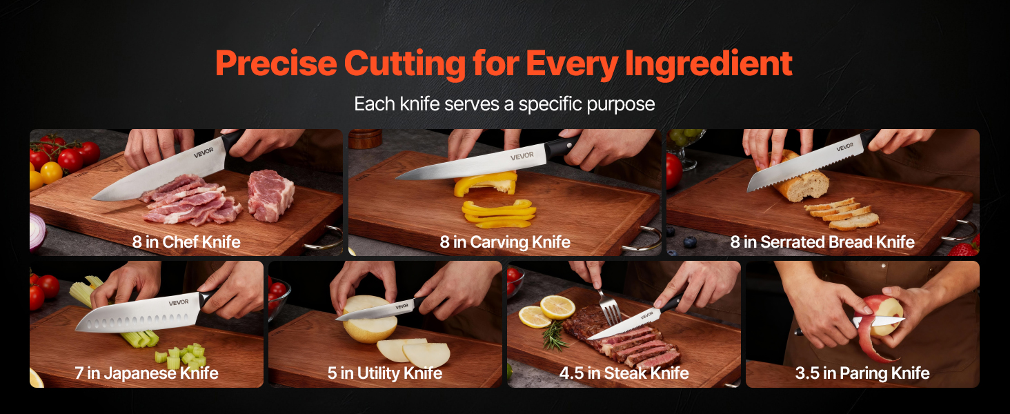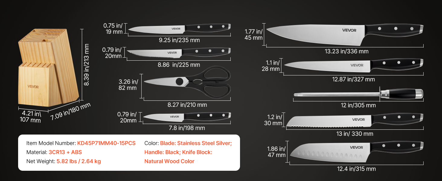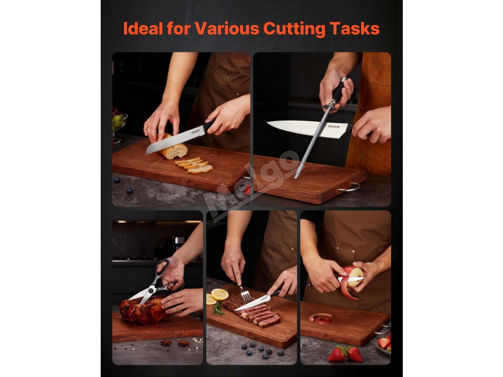 Každý detail tejto súpravy je navrhnutý pre pohodlie. Ergonomická rukoväť ponúka pohodlie a ľahké uchopenie a dizajn vhodný do umývačky riadu uľahčuje čistenie. Drevený blok na nože umožňuje jednoduché skladovanie, zatiaľ čo ocieľka pomáha udržiavať ostrosť čepele.