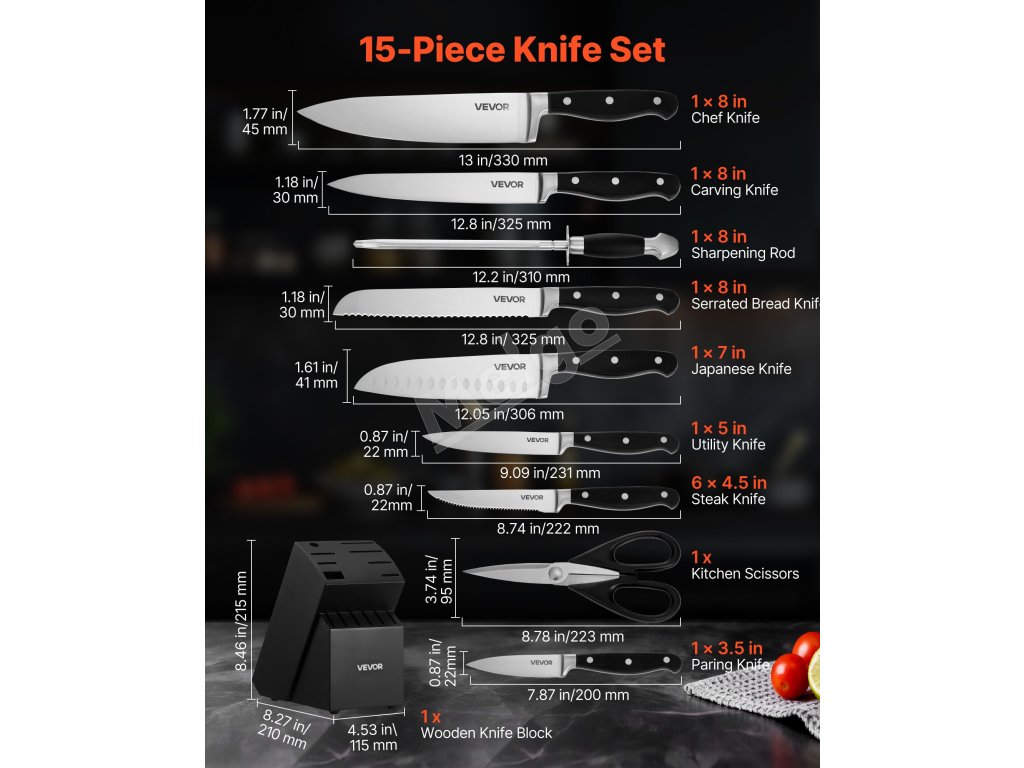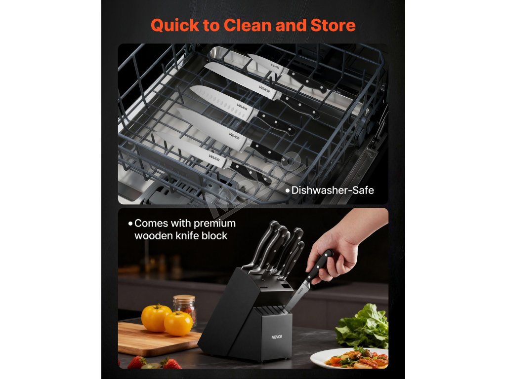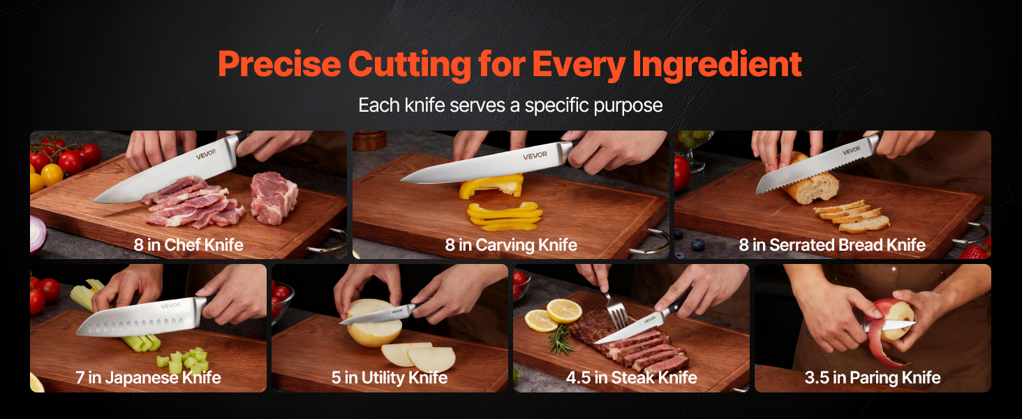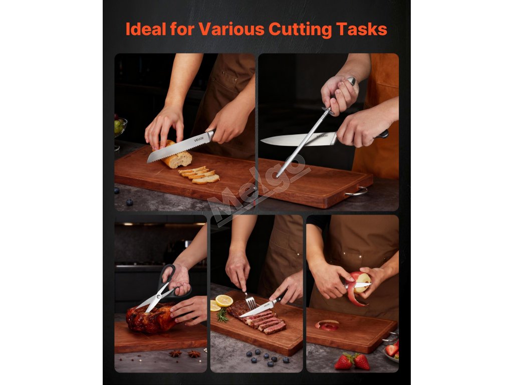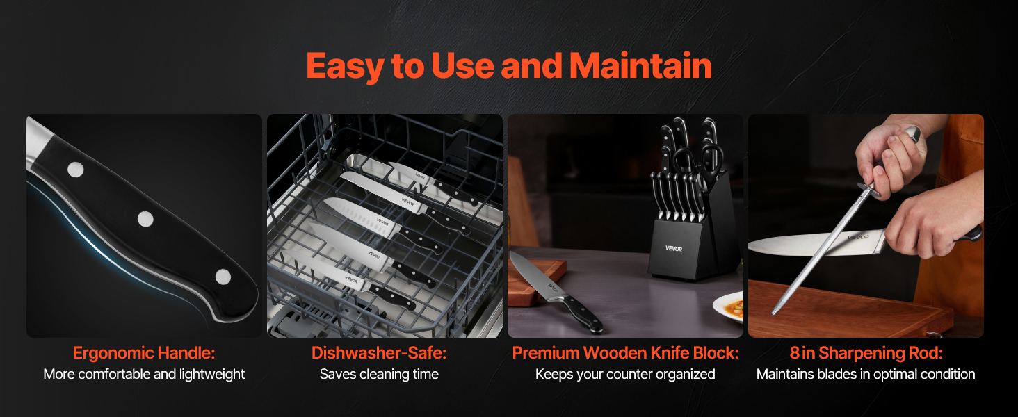 Každý detail tejto súpravy je navrhnutý pre pohodlie. Ergonomická rukoväť ponúka pohodlie a ľahké uchopenie a dizajn vhodný do umývačky riadu uľahčuje čistenie. Drevený blok na nože umožňuje jednoduché skladovanie, zatiaľ čo ocieľka pomáha udržiavať ostrosť čepele.