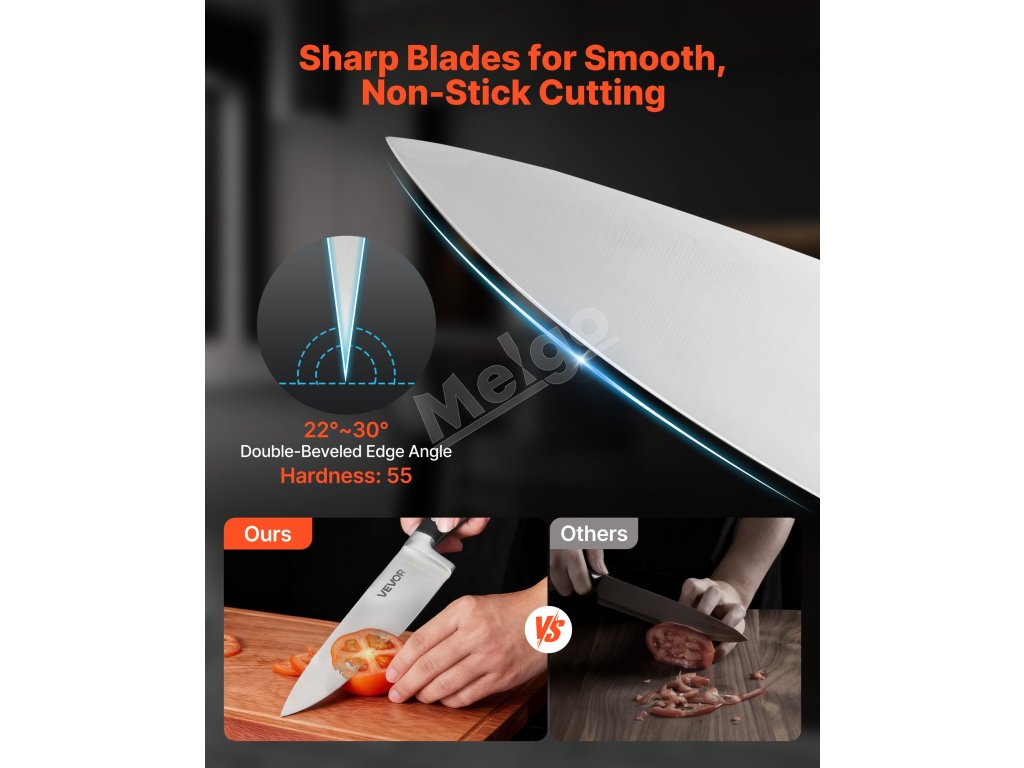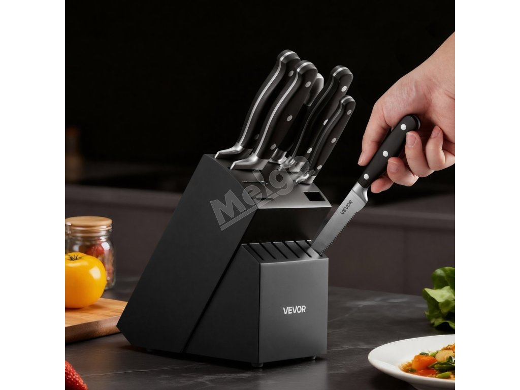 Každá čepeľ je odborne nabrúsená a naostrená pre výnimočnú ostrosť. Rozmanitý výber nožov zabezpečuje presné spracovanie rôznych surovín, čím šetrí váš čas a zvyšuje efektivitu pri každej príprave.