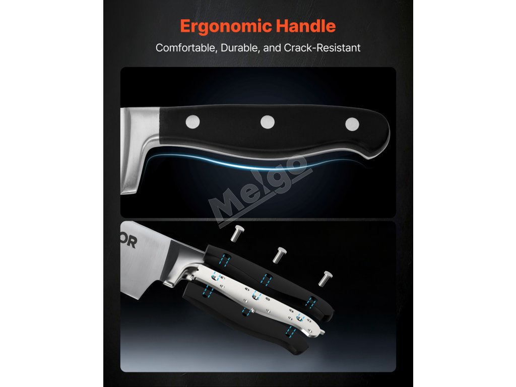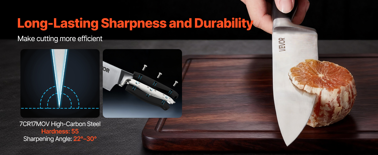 Táto súprava nožov je vyrobená z prvotriednej vysokokarbónovej ocele a ponúka ideálnu rovnováhu medzi tvrdosťou a húževnatosťou, čím si zachováva dlhotrvajúcu ostrosť bez častého ostrenia. Rukoväť je odolná proti prasknutiu a bezpečne pripevnená, čo vám dodá stabilitu a istotu pri každom použití.