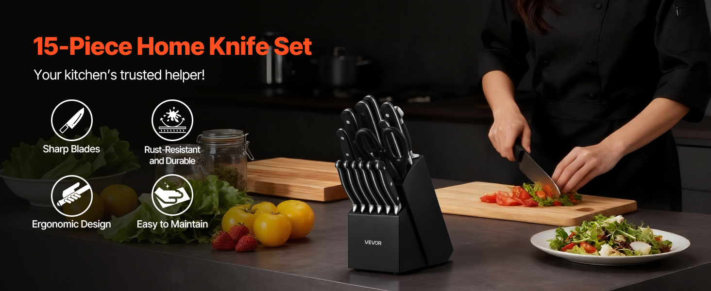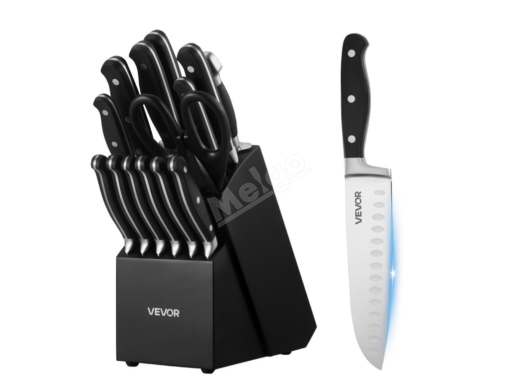 Naša 15-dielna súprava nožov pokryje všetky vaše potreby pri krájaní! Je vyrobená z vysokokarbónovej nehrdzavejúcej ocele s presným ostrením, takže zostáva ostrá a odolná. Ergonomické rukoväte zaisťujú pohodlné držanie a znižujú únavu. Súčasťou je prémiový drevený blok a 8-palcový brúsik na jednoduché skladovanie a údržbu. Štýlový dizajn z neho robí skvelý darček pre seba alebo svojich blízkych.