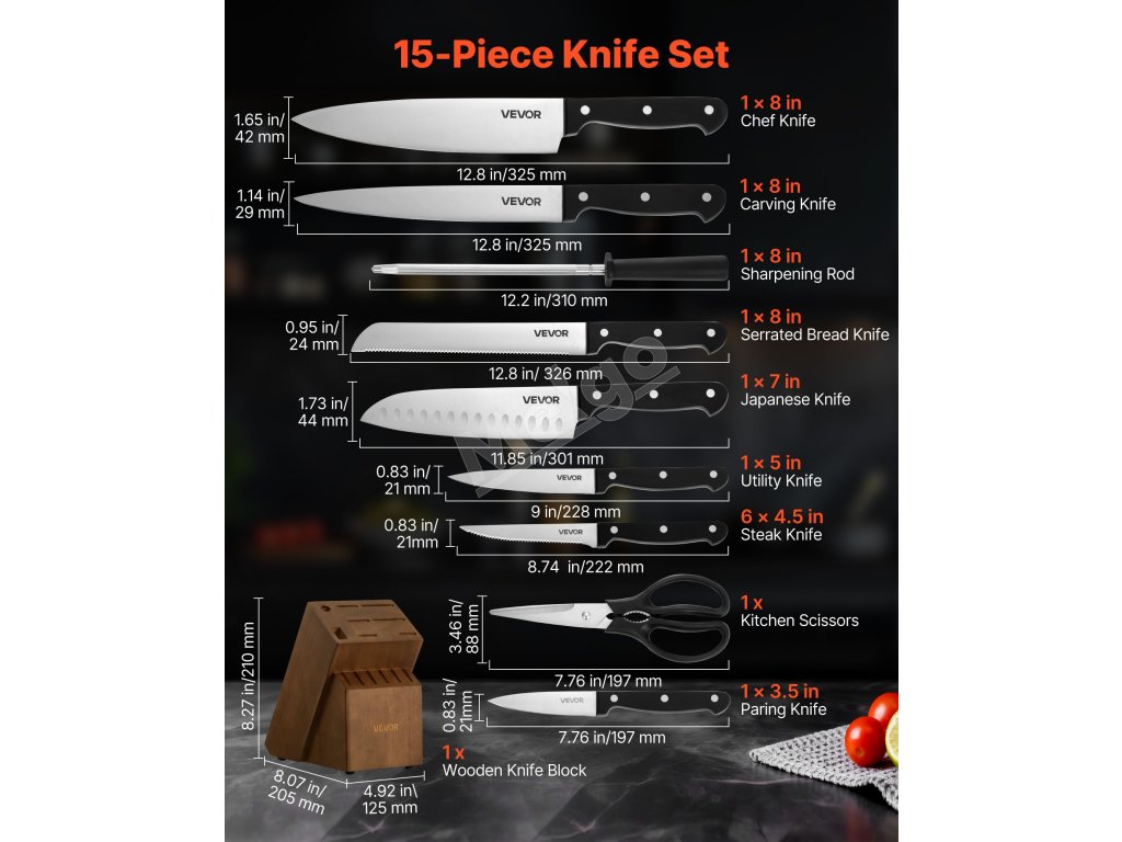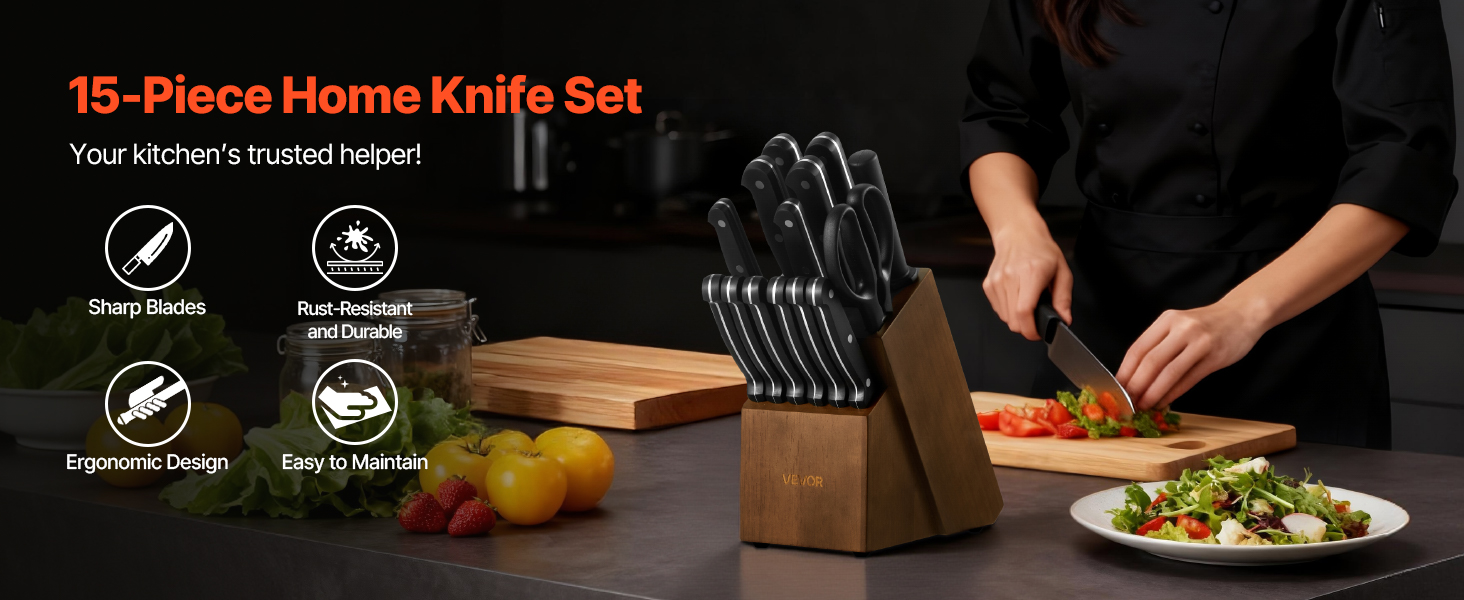 Naša 15-dielna súprava nožov pokryje všetky vaše potreby pri krájaní! Je vyrobená z vysokokarbónovej nehrdzavejúcej ocele s presným ostrením, takže zostáva ostrá a odolná. Ergonomické rukoväte zaisťujú pohodlné držanie a znižujú únavu. Súčasťou je prémiový drevený blok a 8-palcový brúsik na jednoduché skladovanie a údržbu. Vďaka štýlovému dizajnu je skvelým darčekom pre vás alebo vašich blízkych.