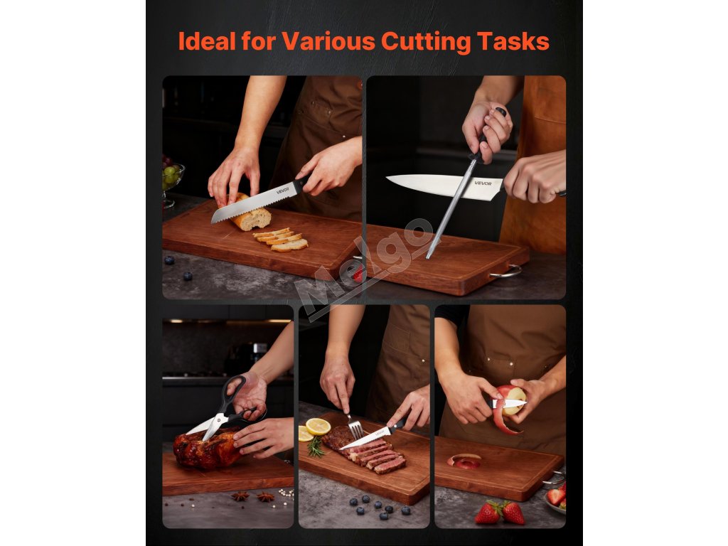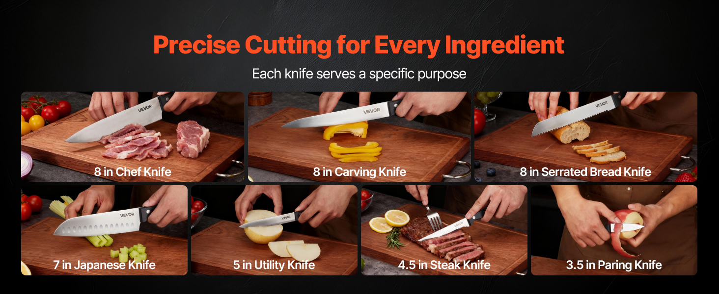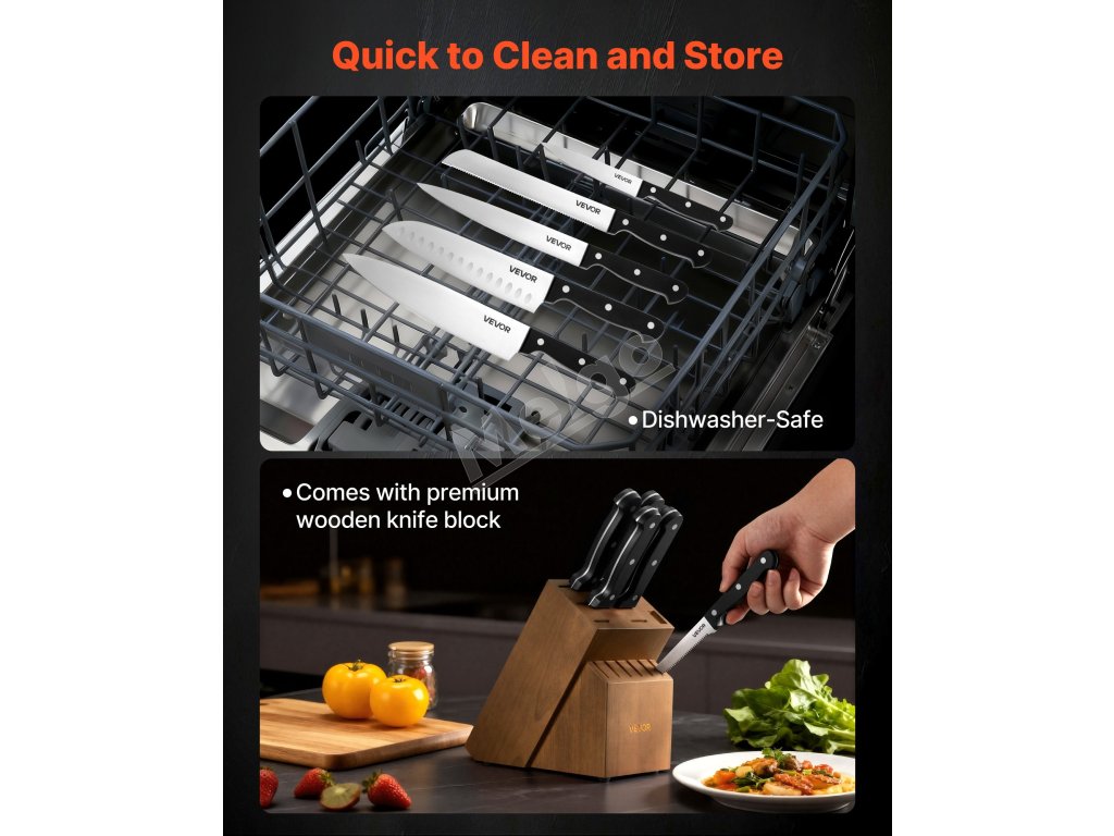 Každý detail tejto súpravy je navrhnutý pre pohodlie. Ergonomická rukoväť ponúka pohodlie a ľahké uchopenie a dizajn vhodný do umývačky riadu uľahčuje čistenie. Drevený blok na nože umožňuje jednoduché skladovanie, zatiaľ čo ocieľka pomáha udržiavať ostrosť čepele.