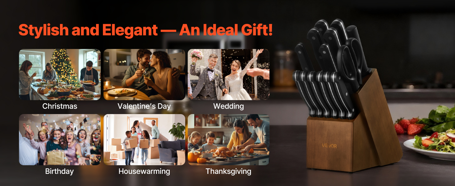 Táto súprava nožov z nehrdzavejúcej ocele v sebe spája eleganciu a praktickosť a obohatí vašu kuchyňu o moderný, rafinovaný nádych. Je to ideálny darček na Valentína, Vianoce, svadby a narodeniny - nezabudnuteľné prekvapenie pre milovníkov varenia.
