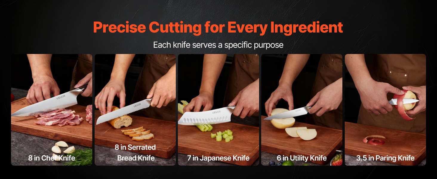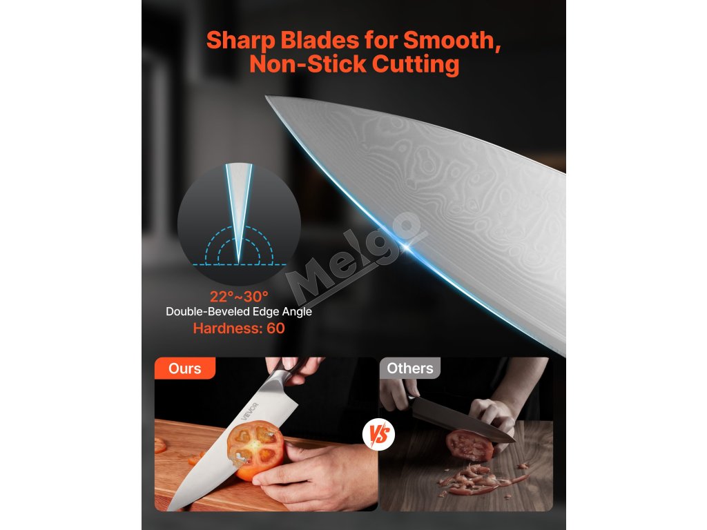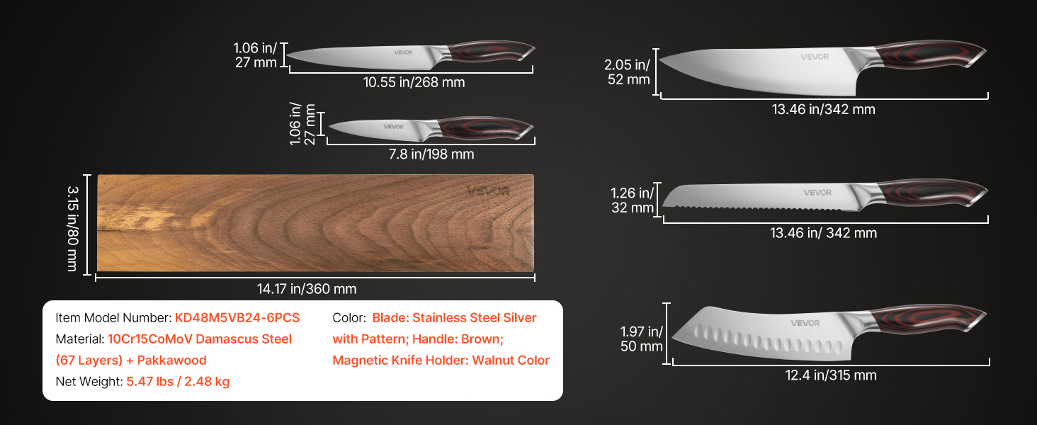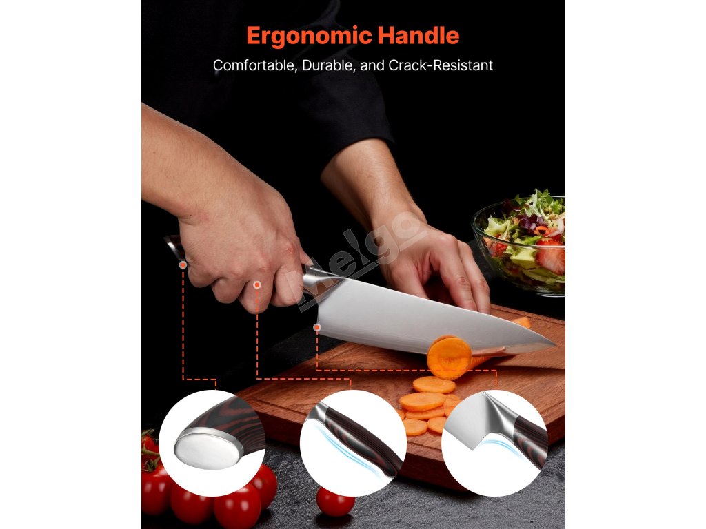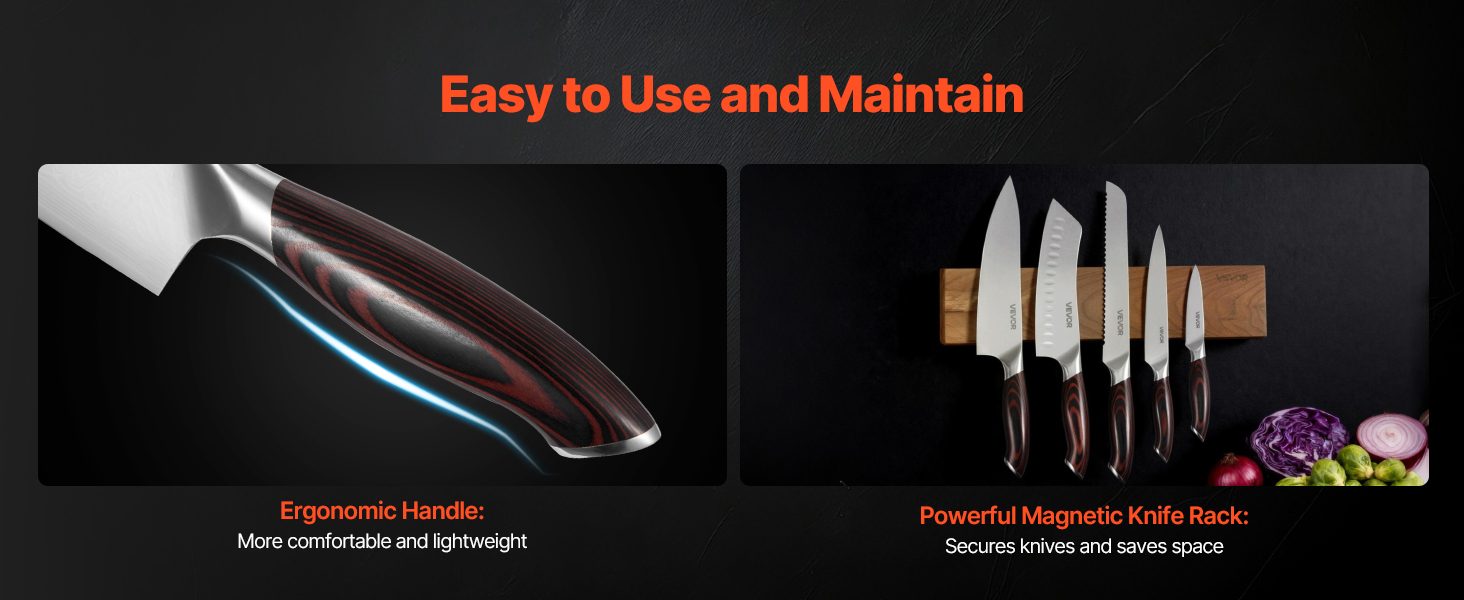Každý detail tejto súpravy je navrhnutý pre pohodlie. Ergonomická rukoväť zaisťuje pohodlie a rovnováhu a priložený magnetický držiak na nože možno pripevniť na stenu, aby bezpečne držal nože silnou magnetickou silou na jednoduchý prístup a skladovanie.