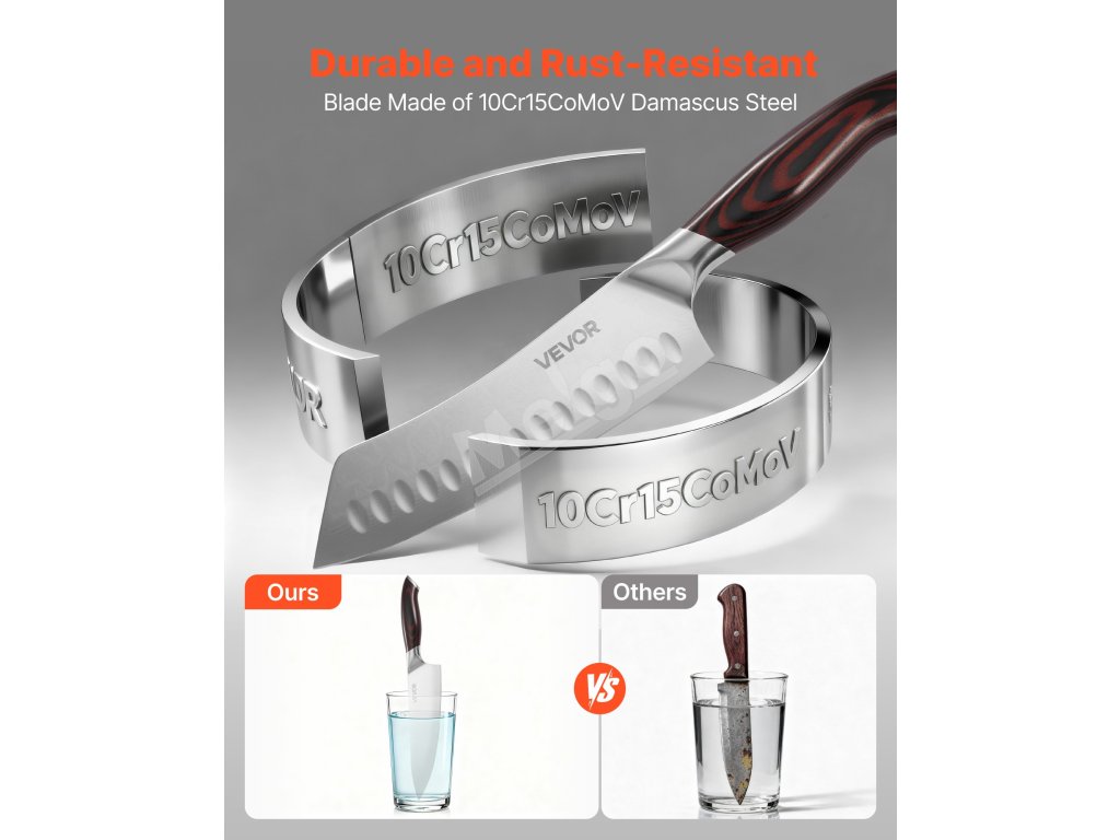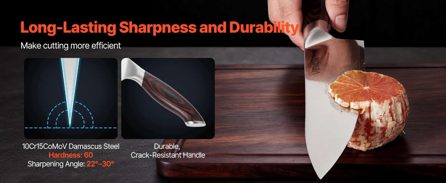 Táto súprava nožov je vyrobená z prvotriednej vysokokarbónovej ocele a ponúka ideálnu rovnováhu medzi tvrdosťou a húževnatosťou, čím si zachováva dlhotrvajúcu ostrosť bez častého ostrenia. Rukoväť je odolná proti prasknutiu a bezpečne pripevnená, čo vám dodá stabilitu a istotu pri každom použití.