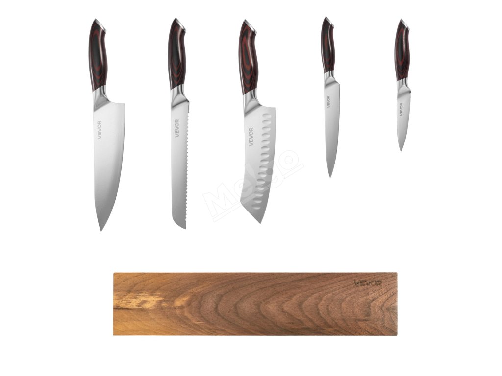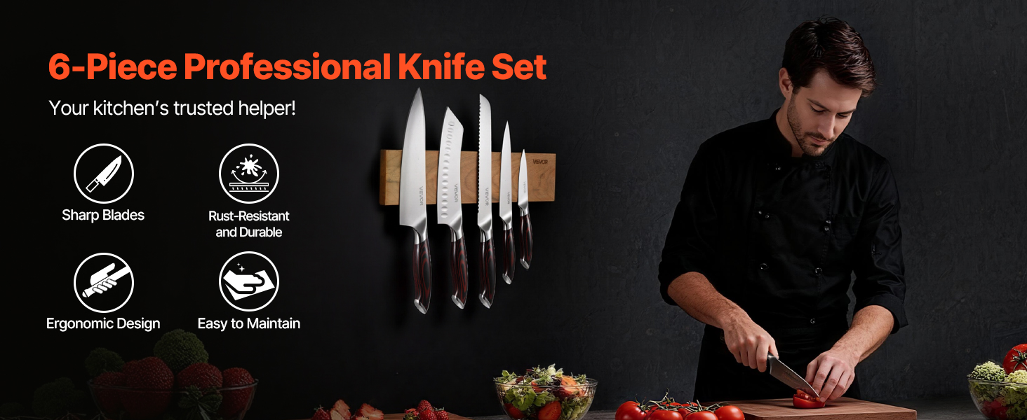 Naša 6-dielna profesionálna súprava nožov spĺňa všetky vaše potreby pri krájaní! Je vyrobená z vysokokarbónovej nehrdzavejúcej ocele s presným ostrením a poskytuje trvalú ostrosť a odolnosť. Ergonomické rukoväte ponúkajú pohodlné držanie, zatiaľ čo silný magnetický držiak udržiava nože usporiadané a šetrí miesto na pracovnej doske. Vďaka elegantnému, modernému vzhľadu je ideálny pre vás alebo vašich blízkych.