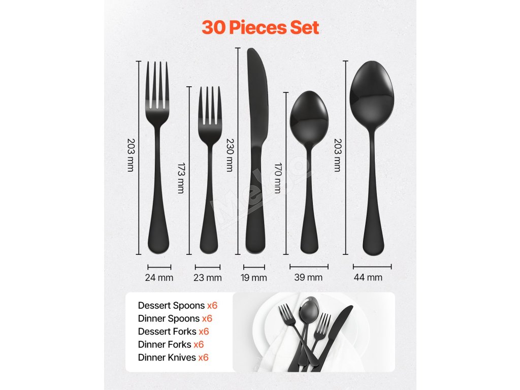 | Typ | Dezertné lyžice, Večerné lyžice, Večerné nože, Dezertné vidličky, Večerné vidličky |