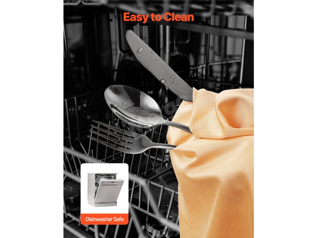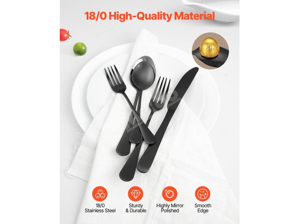 Táto súprava príborov je vyrobená z prvotriednej nehrdzavejúcej ocele 18/0, je odolná, nehrdzavejúca a dobre vyvážená. Dizajn s hladkými hranami poskytuje pohodlie počas používania. Dá sa umývať v umývačke riadu, má ideálnu hmotnosť a hrúbku na jednoduchú manipuláciu, čo zaručuje dlhodobú životnosť.