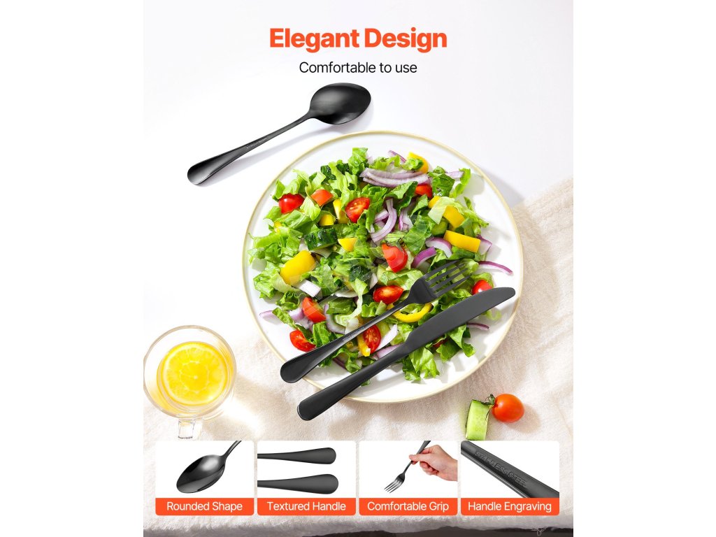 Súprava príborov sa môže pochváliť elegantným a moderným dizajnom, ktorý bez problémov doplní rôzne stolovanie, od bežných jedál až po formálne príležitosti. Jej sofistikovaný štýl umocní váš zážitok zo stolovania.