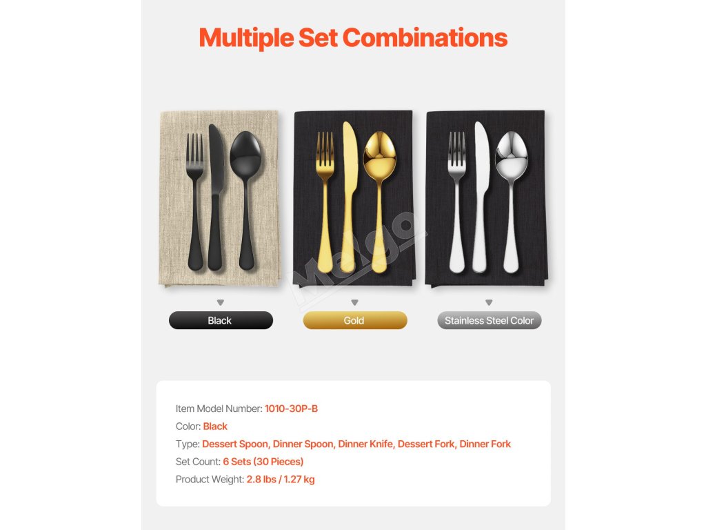 Táto súprava obsahuje kombináciu 2 typov lyžíc, 2 typov vidličiek a 1 typu noža, vrátane dezertných lyžíc, obedových lyžíc, obedových nožov, dezertných vidličiek a vidličiek na večeru, ktoré spĺňajú vaše každodenné potreby pri stolovaní.