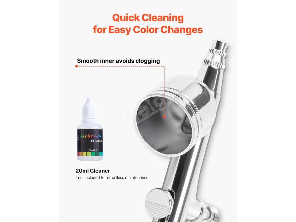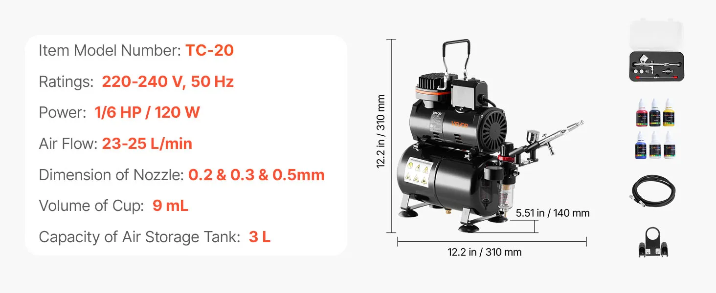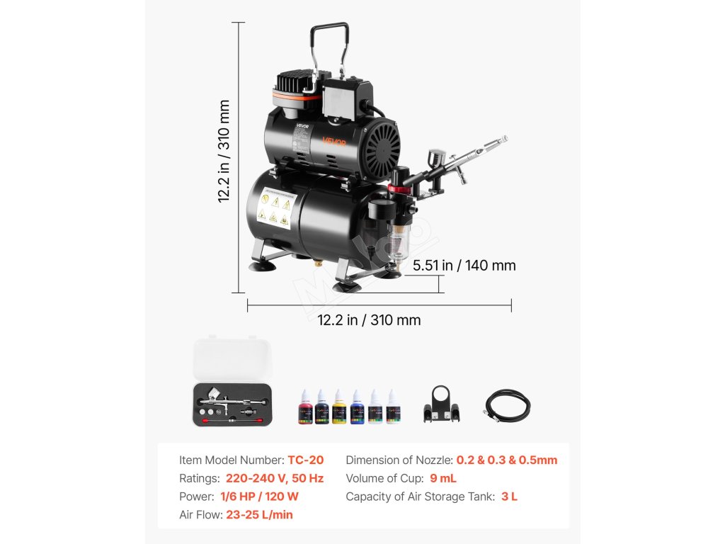 Naša súprava airbrush obsahuje kompresor, dvojčinný airbrush, nádržku na vzduch, 3 trysky (0,2 mm, 0,3 mm, 0,5 mm), 4 akrylové farby, čistič, riedidlo, hadicu a držiak. Nie je potrebné nič dokupovať - ideálne pre začiatočníkov aj profesionálov.