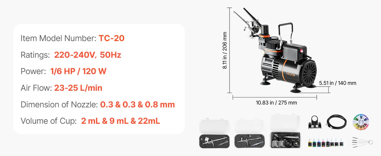 Naša súprava na airbrush obsahuje kompresor, 3 airbrushe, 6 akrylových farieb, riedidlo, čistič, čistiacu kefku, hadicu, držiak a kartu farebných koliesok. Nie sú potrebné žiadne ďalšie nákupy - ideálne pre začiatočníkov aj profesionálov.
