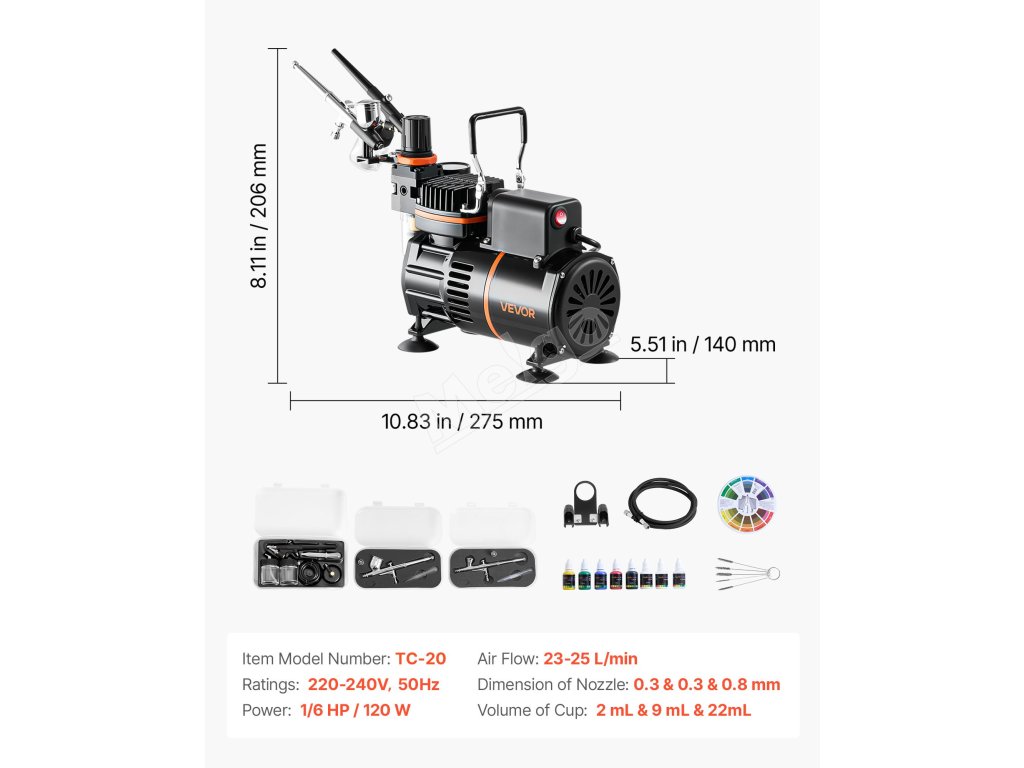Naša súprava na airbrush obsahuje kompresor, 3 airbrushe, 6 akrylových farieb, riedidlo, čistič, čistiacu kefku, hadicu, držiak a kartu farebných koliesok. Nie sú potrebné žiadne ďalšie nákupy - ideálne pre začiatočníkov aj profesionálov.