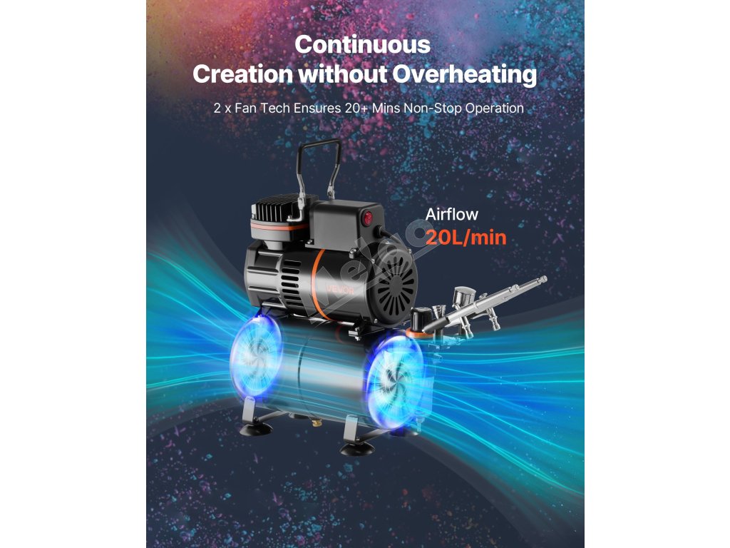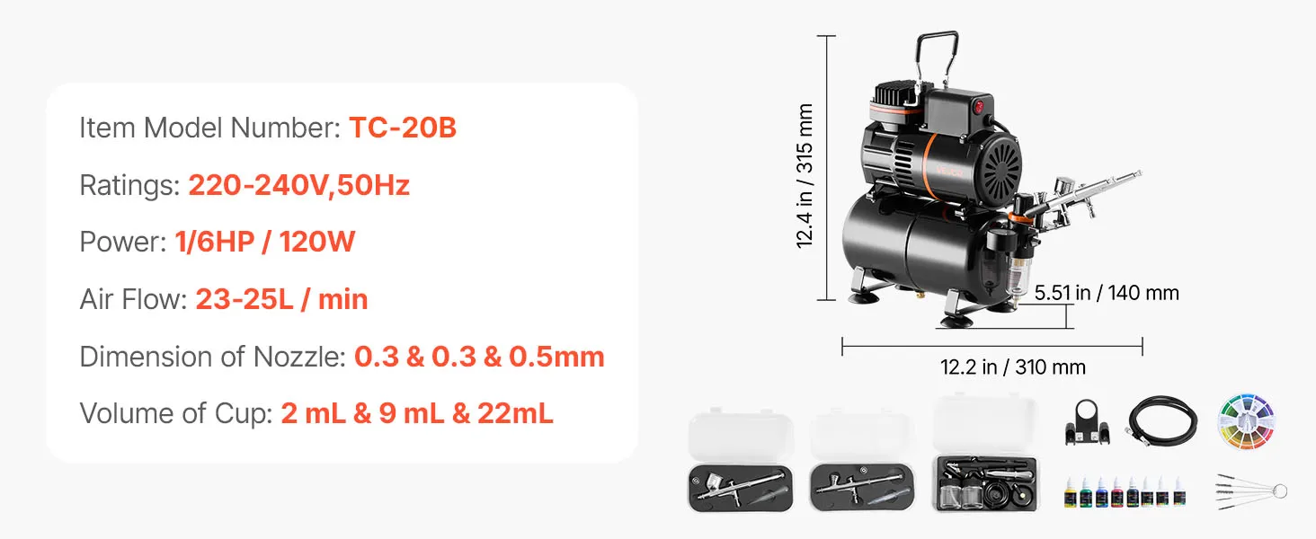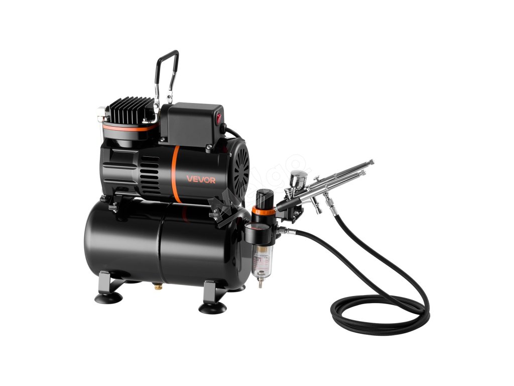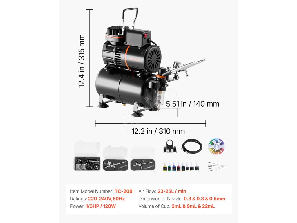 Naša súprava na airbrush obsahuje kompresor, nádržku na vzduch, 3 airbrushe, 6 akrylových farieb, riedidlo, čistič, čistiacu kefku, hadicu, držiak a kartu farebných koliesok. Nie sú potrebné žiadne ďalšie nákupy - ideálne pre začiatočníkov aj profesionálov.
