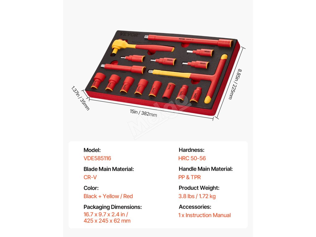 Táto 16-dielna sada izolovaných nástrčiek je navrhnutá tak, aby spĺňala rôzne potreby opráv. Vďaka vynikajúcej prenosnosti a praktickosti je ideálnou voľbou na každodenné domáce opravy, profesionálnu údržbu elektrických zariadení a práce v automobilovom priemysle.
