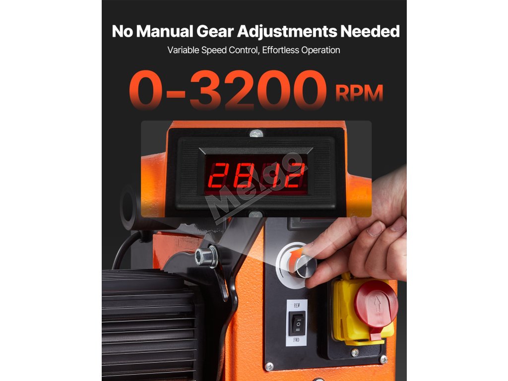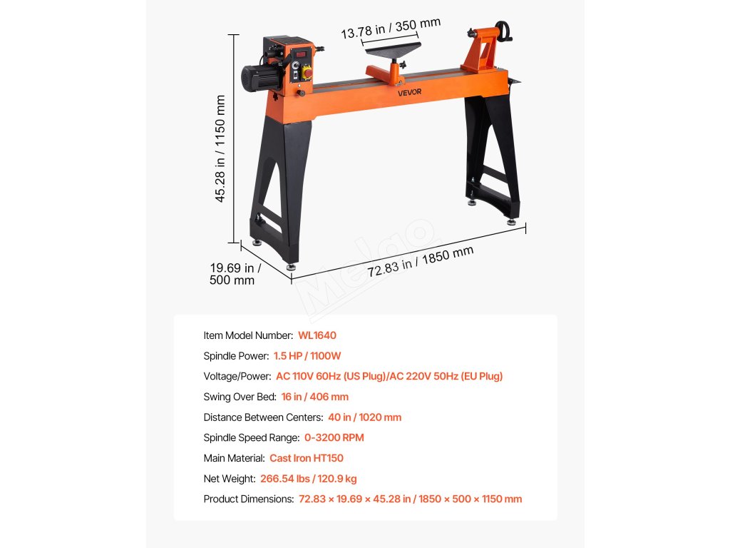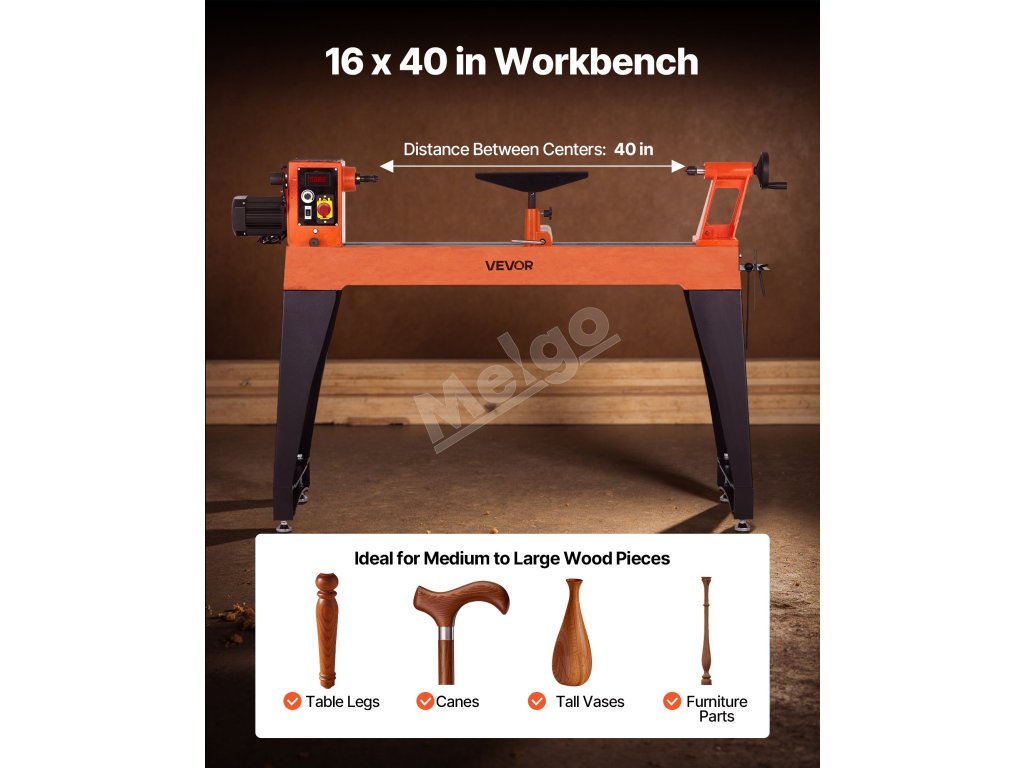 Tento sústruh na drevo je vybavený motorom s výkonom 1,5 HP/1100 W s plynulou reguláciou otáčok v rozsahu od 0 do 3200 ot. Pracovný stôl s rozmermi 16 x 40 palcov je ideálny na spracovanie stredne veľkých až veľkých projektov, ako sú stolové nohy, vázy a ďalšie. Vďaka masívnemu liatinovému telu sa hodí pre profesionálnych stolárov.