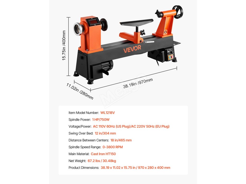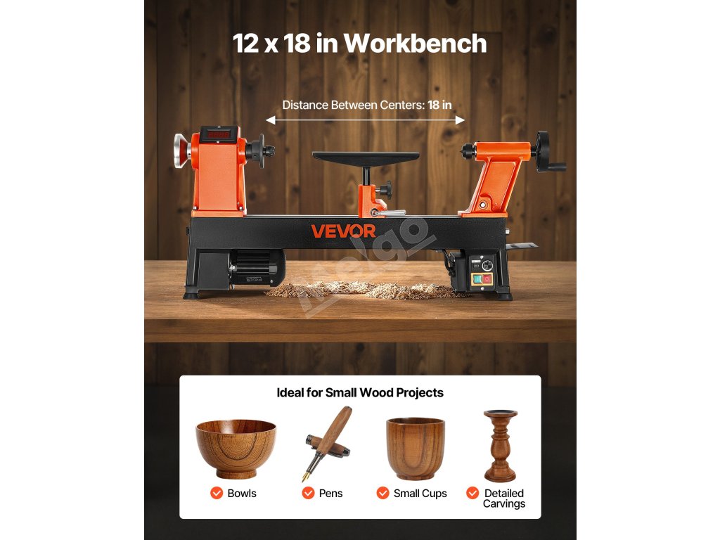 Tento sústruh na drevo je vybavený motorom s výkonom 1 HP/750 W s plynulou reguláciou otáčok v rozsahu od 0 do 3800 ot. Pracovný stôl s rozmermi 12 x 18 palcov je ideálny na sústruženie menších projektov, ako sú misy, perá a iné jemné predmety. S odolným liatinovým telom sa hodí pre začiatočníkov aj domácich majstrov.