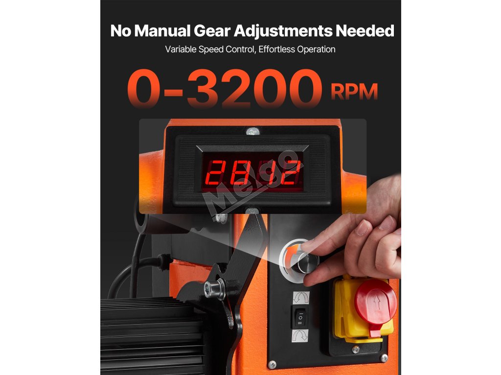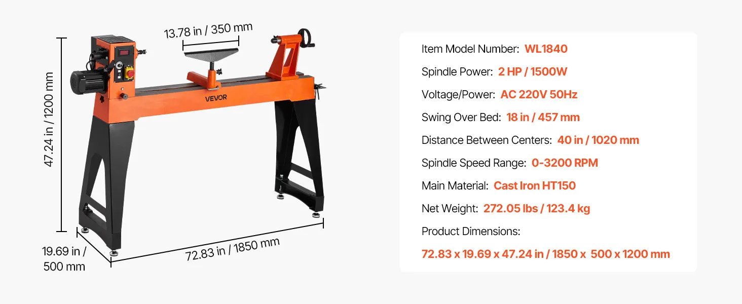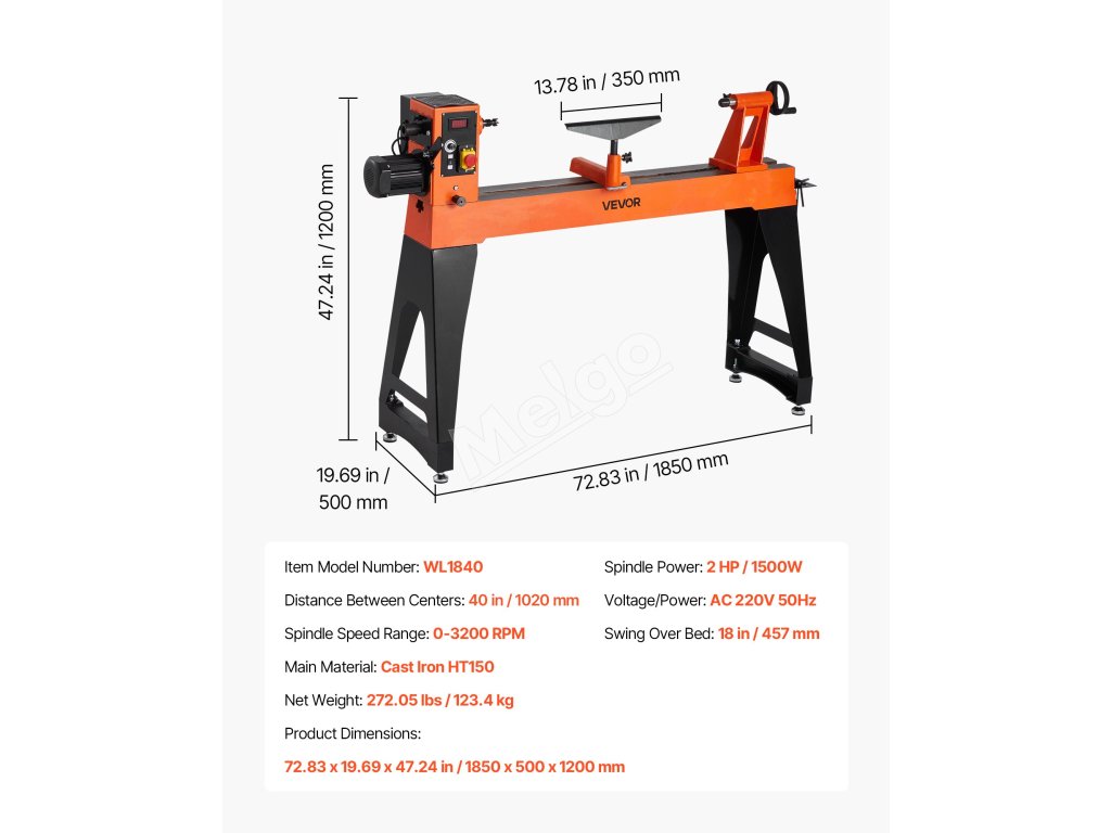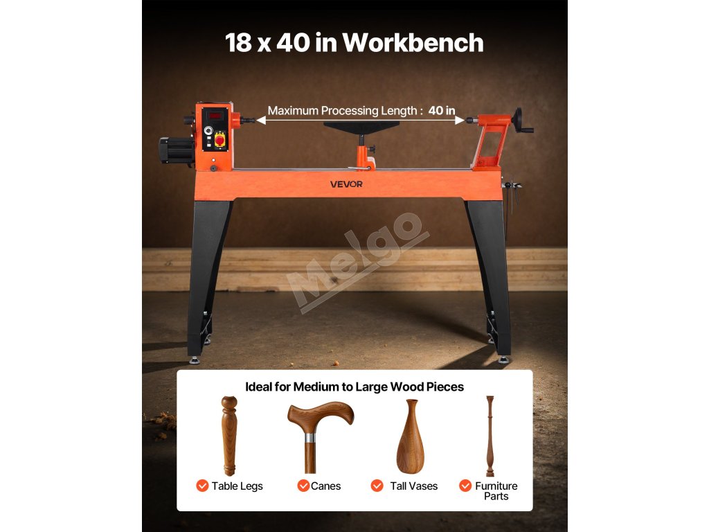 Tento sústruh na drevo je vybavený motorom s výkonom 2 HP/1500 W s plynulou reguláciou otáčok v rozsahu od 0 do 3200 ot. Pracovný stôl s rozmermi 18 x 40 palcov je ideálny na spracovanie stredne veľkých až veľkých projektov, ako sú stolové nohy, vázy a ďalšie. Vďaka masívnemu liatinovému telu sa hodí pre profesionálnych stolárov.