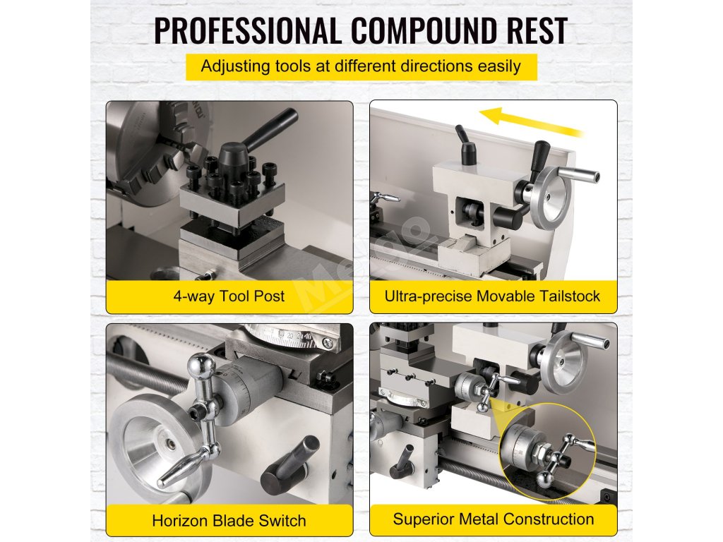 Mini sústruh má 3-čeľusťové skľučovadlo. Sklíčidlo sa široko používa tam, kde sa vyžaduje presné obrábanie. štvorcestná opierka nástrojov ponúka polohy rezania. Tepelne kalené vedenie.