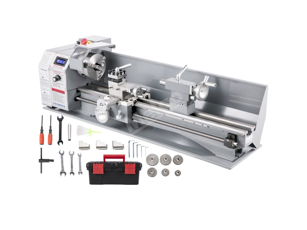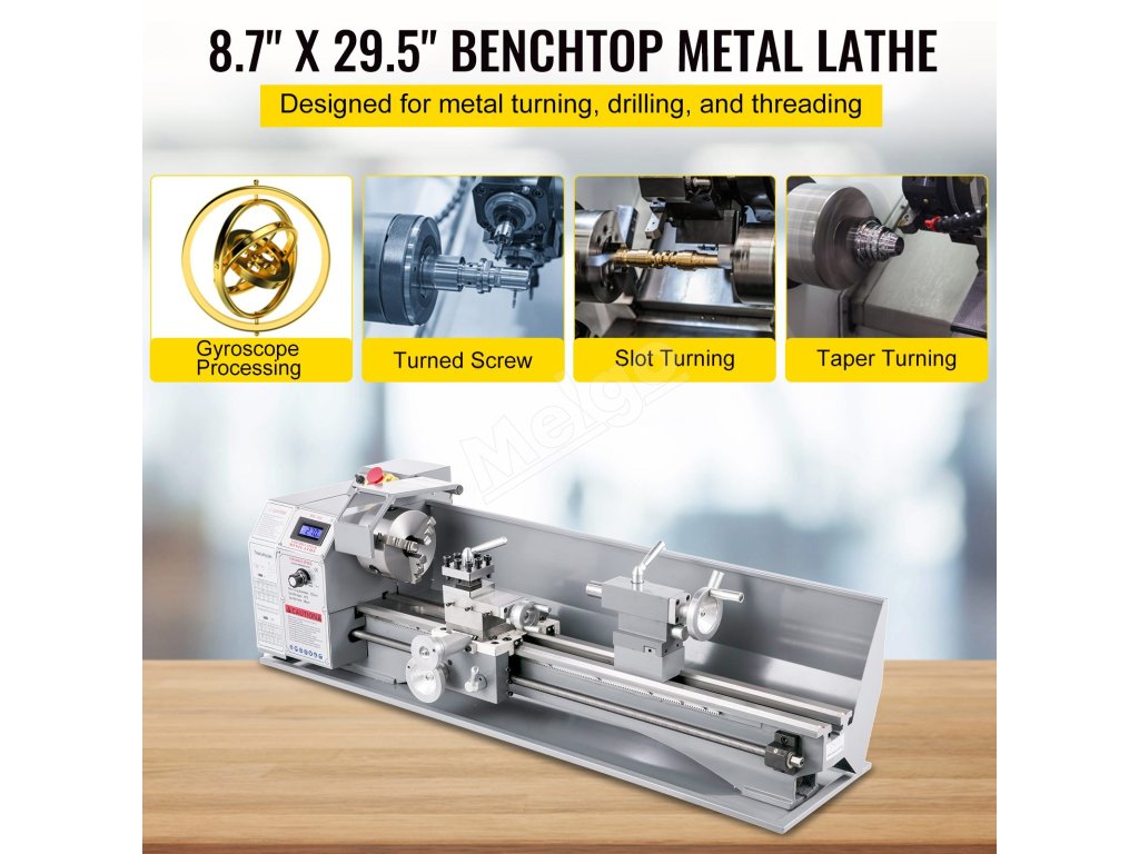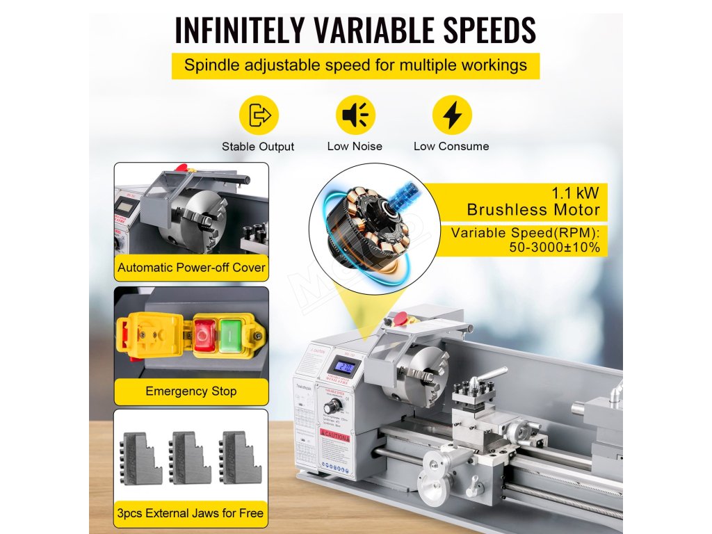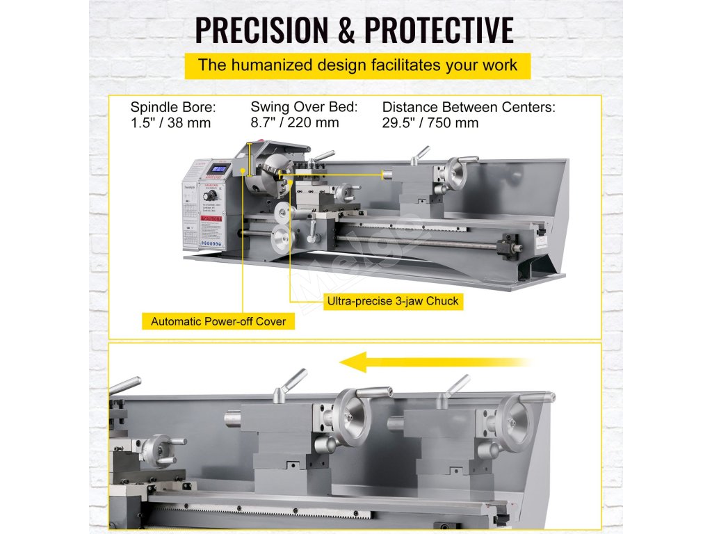 Presný minisústruh na kov s rozmermi 220 x 750 mm je vybavený 1100W motorom, 3-čeľusťovým skľučovadlom, kužeľom vretena MT5, kužeľom koníka MT2, určený na vykonávanie rôznych typov sústruženia kovov, jednoduchý na obsluhu. Prostredníctvom vysokofrekvenčného kalenia a presného brúsenia kvalitného liatinového lôžka. otáčky vretena 50 - 2250 ± 10 % ot/min sú plynule nastaviteľné. Stabilná opierka a následná opierka pre veľké rozmery a/alebo ťažké obrobky.