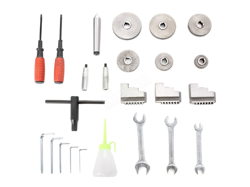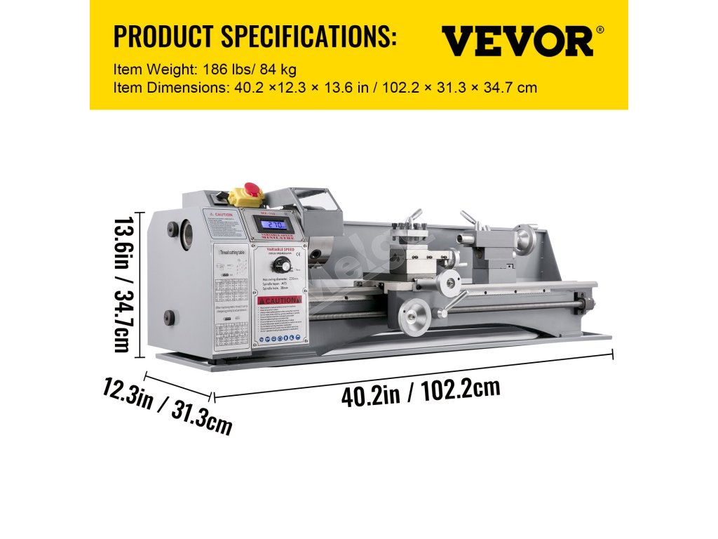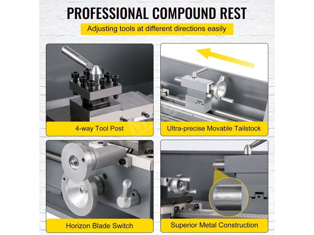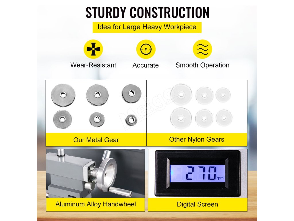 Presný minisústruh na kov s rozmermi 220 x 750 mm je vybavený 1100W motorom, 3-čeľusťovým skľučovadlom, kužeľom vretena MT5, kužeľom koníka MT2, určený na vykonávanie rôznych typov sústruženia kovov, jednoduchý na obsluhu. Prostredníctvom vysokofrekvenčného kalenia a presného brúsenia kvalitného liatinového lôžka. otáčky vretena 50 - 2250 ± 10 % ot/min sú plynule nastaviteľné. Stabilná opierka a následná opierka pre veľké rozmery a/alebo ťažké obrobky.