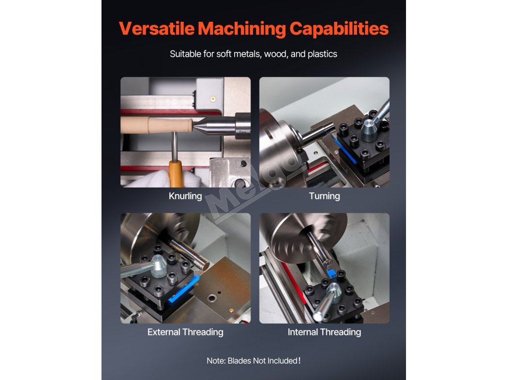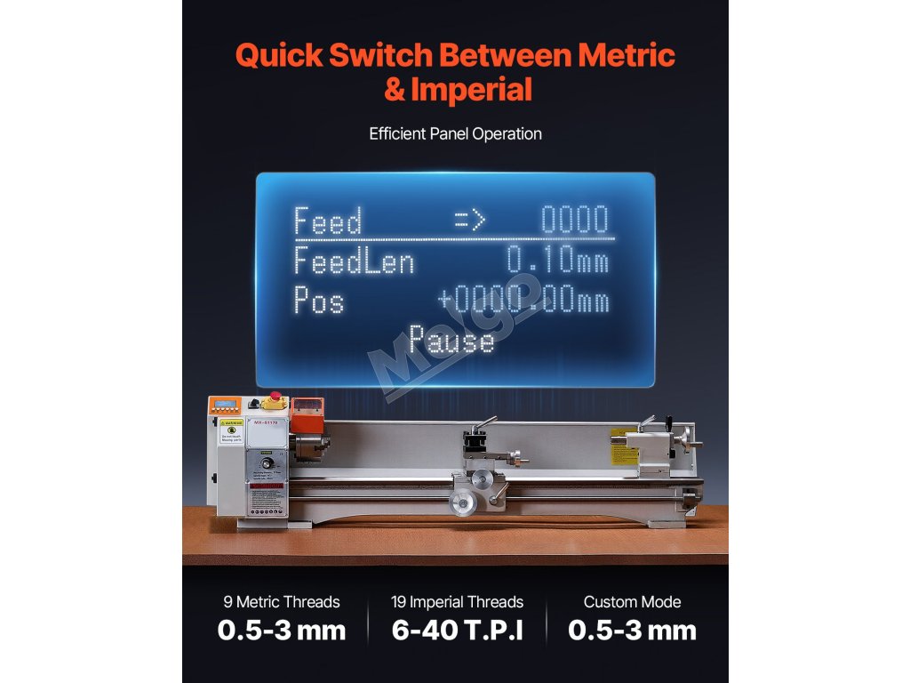 Tento výkonný sústruh na kov má elektronický systém závitovania, ktorý umožňuje jednoduché prepínanie medzi metrickými a imperiálnymi jednotkami. Podporuje plne automatické podávanie a má bezremienkový pohonný systém. Je ideálny na spracovanie mäkkých kovov, akrylátov a plastov, ako aj na výrobu foriem, opravy dielov atď.