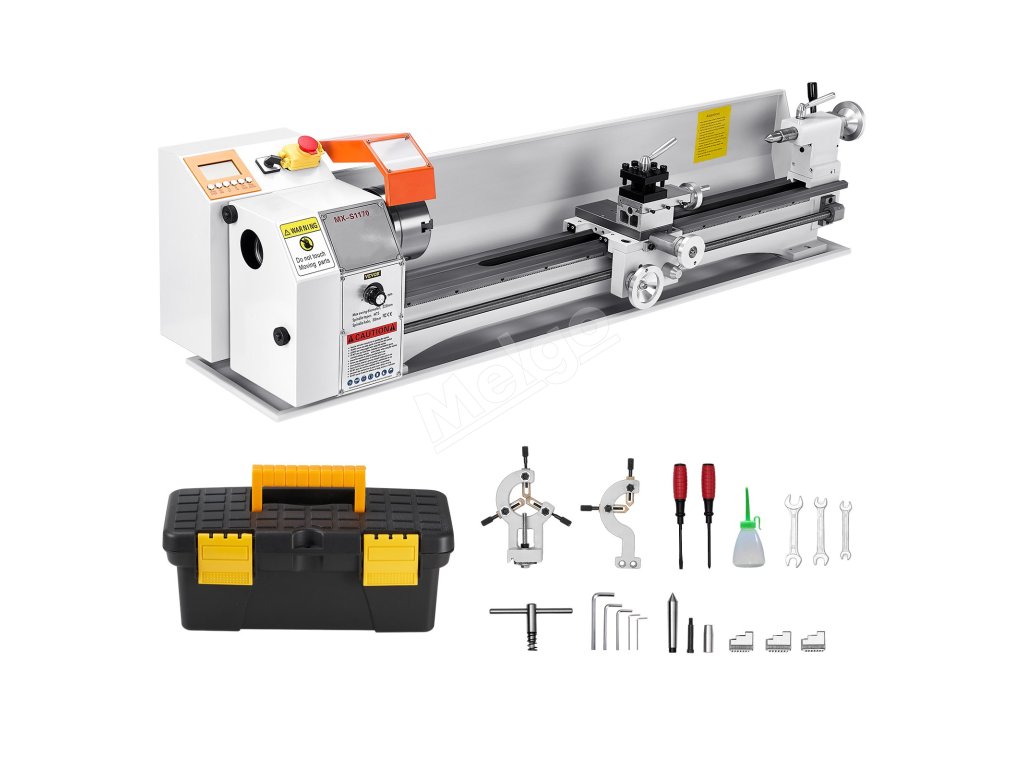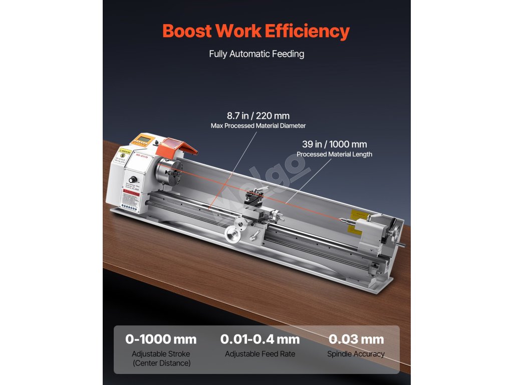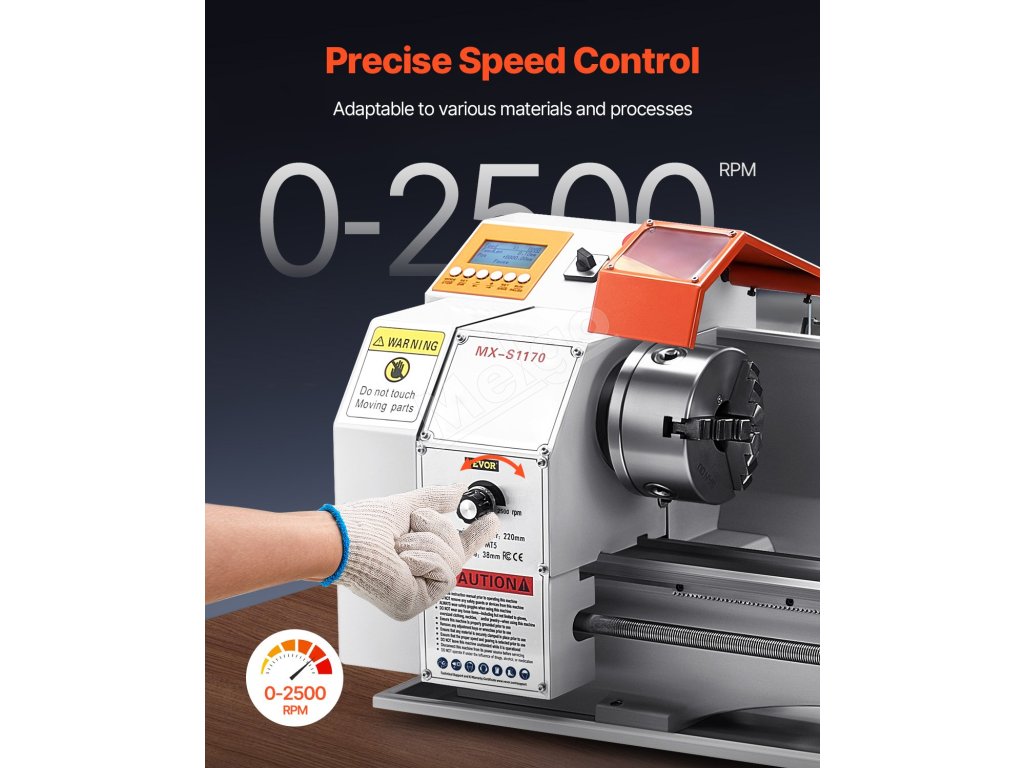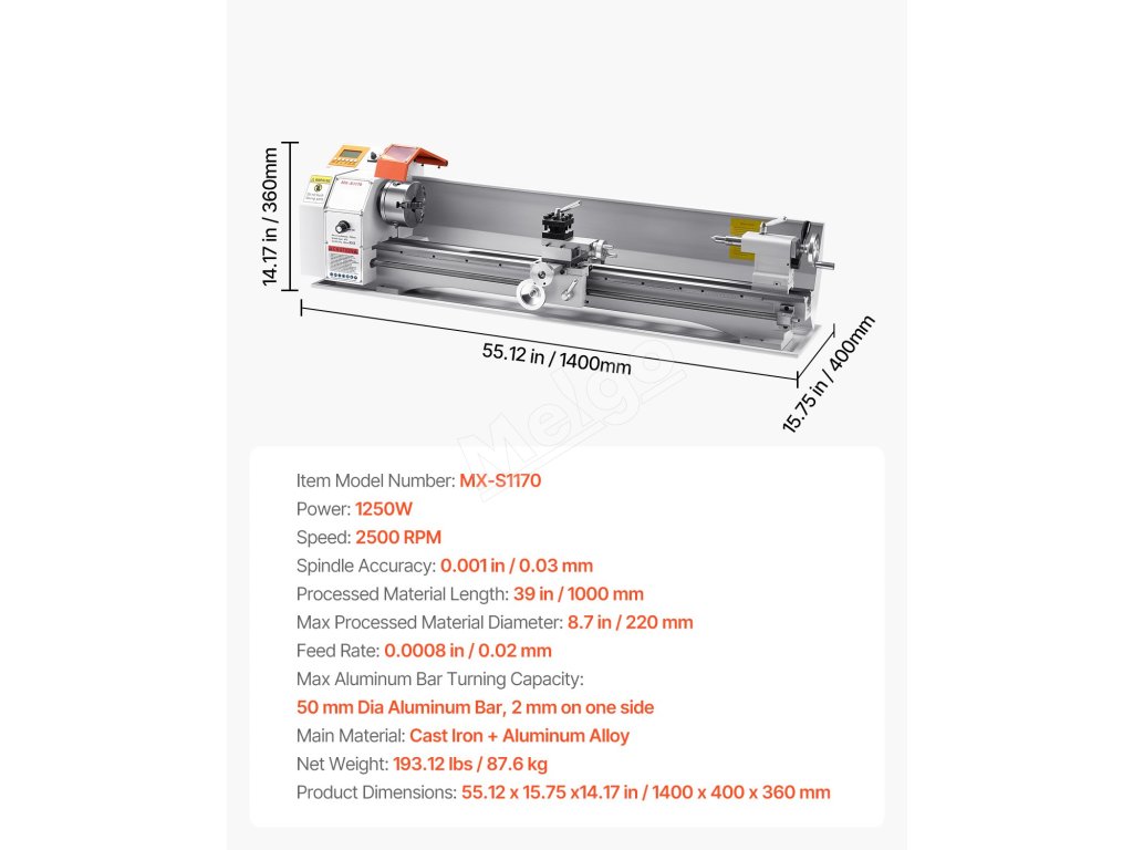 Tento sústruh na kov s rozmermi 8,7 x 39 palcov je poháňaný robustným 1250W motorom, ktorý poskytuje vysoké otáčky 2500 ot/min a presnosť vretena 0,001 palca / 0,03 mm pre presné výsledky obrábania.