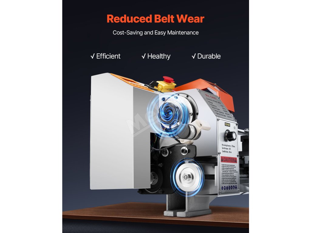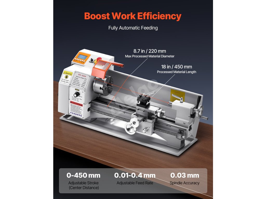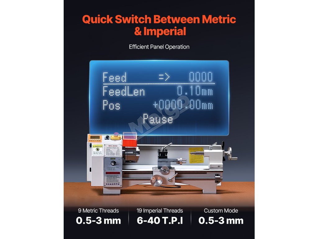 Tento výkonný sústruh na kov má elektronický systém závitovania, ktorý umožňuje jednoduché prepínanie medzi metrickými a imperiálnymi jednotkami. Podporuje plne automatické podávanie a má bezremienkový pohonný systém. Je ideálny na spracovanie mäkkých kovov, akrylátov a plastov, ako aj na výrobu foriem, opravy dielov atď.