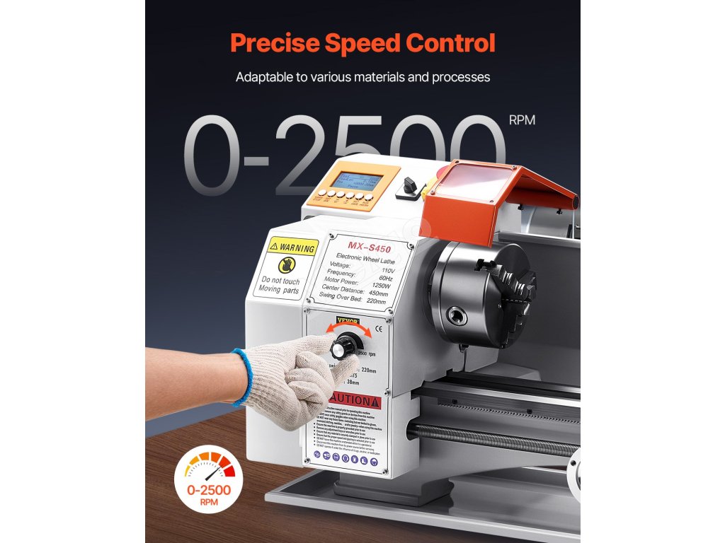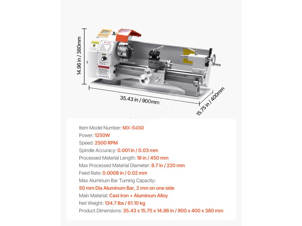 Tento sústruh na kov s rozmermi 8,7 x 18 palcov je poháňaný robustným 1250W motorom, ktorý poskytuje vysoké otáčky 2500 ot/min a presnosť vretena 0,001 palca / 0,03 mm na dosiahnutie presných výsledkov obrábania.