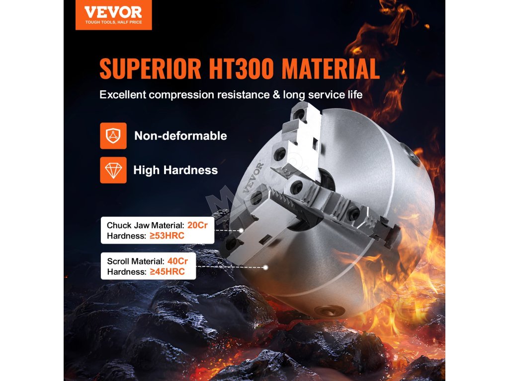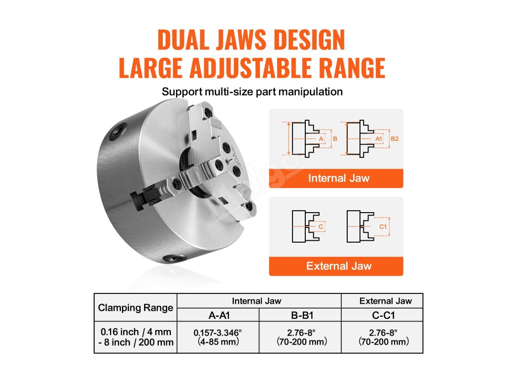 8'' 3-čeľusťové sústružnícke skľučovadlo je vyrobené z vysokopevnostného materiálu HT300 so silnou odolnosťou proti stlačeniu a dlhou životnosťou. Možno ho použiť ako vnútorné a vonkajšie čeľuste na upínanie priemyselných súčiastok väčších rozmerov a funkciu samocentrovania, aby sa zabránilo opakovanej kalibrácii.