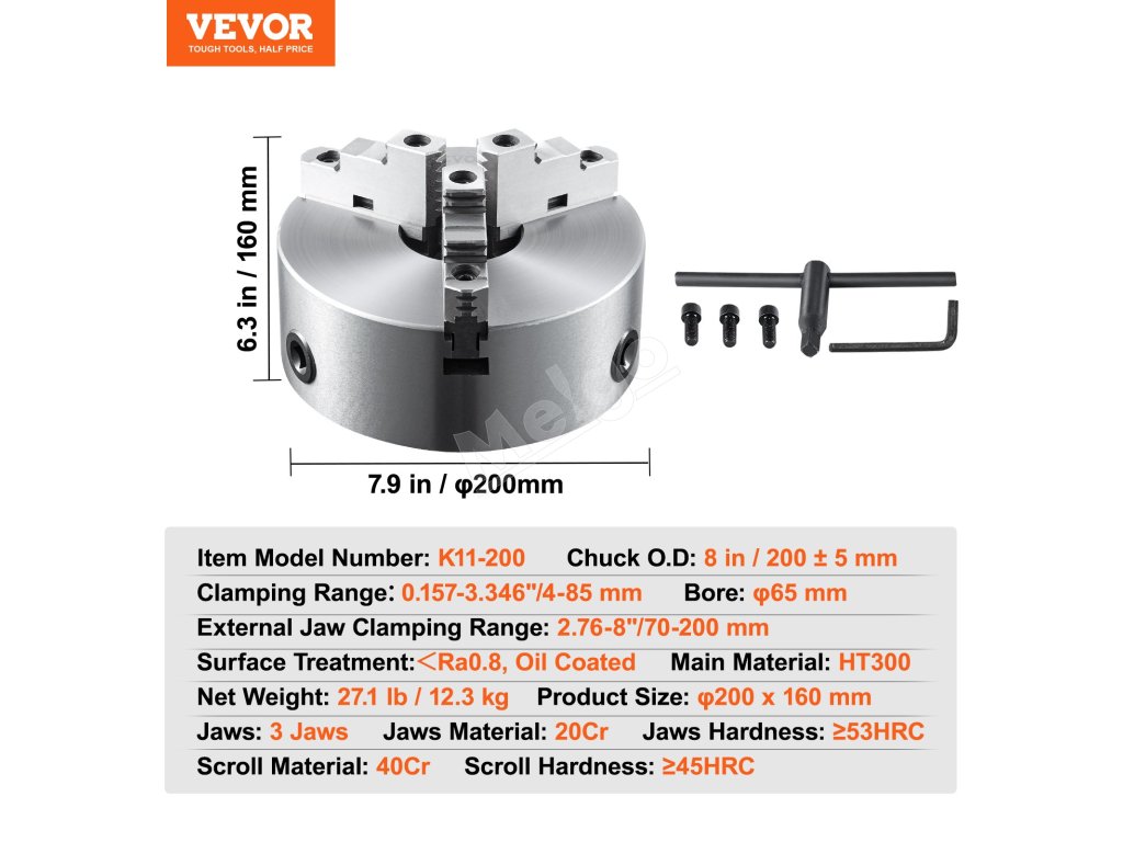 | Čeľuste | 3 čeľuste, 20Cr, ≥53HRC |