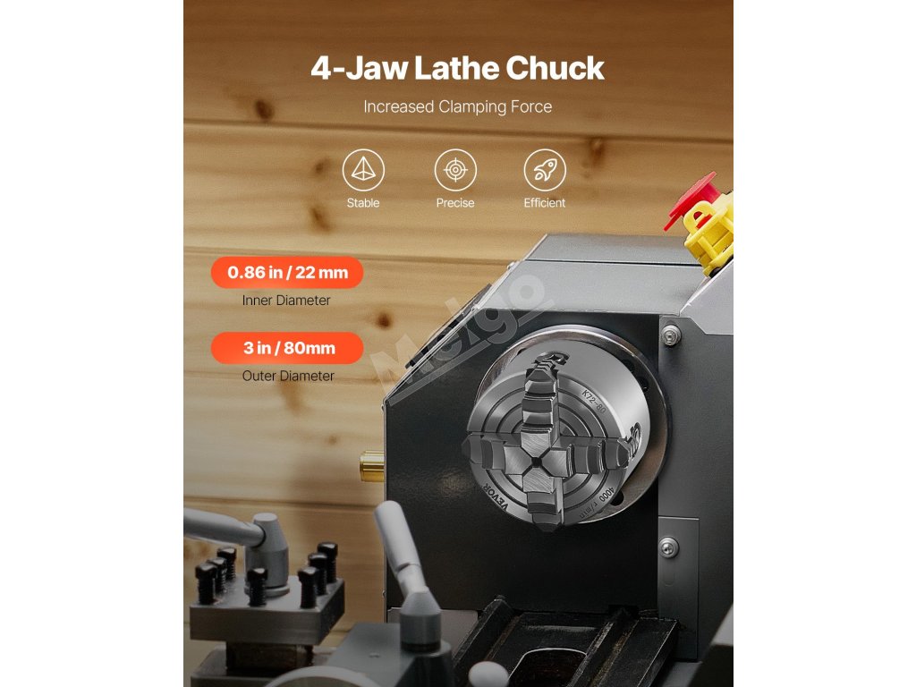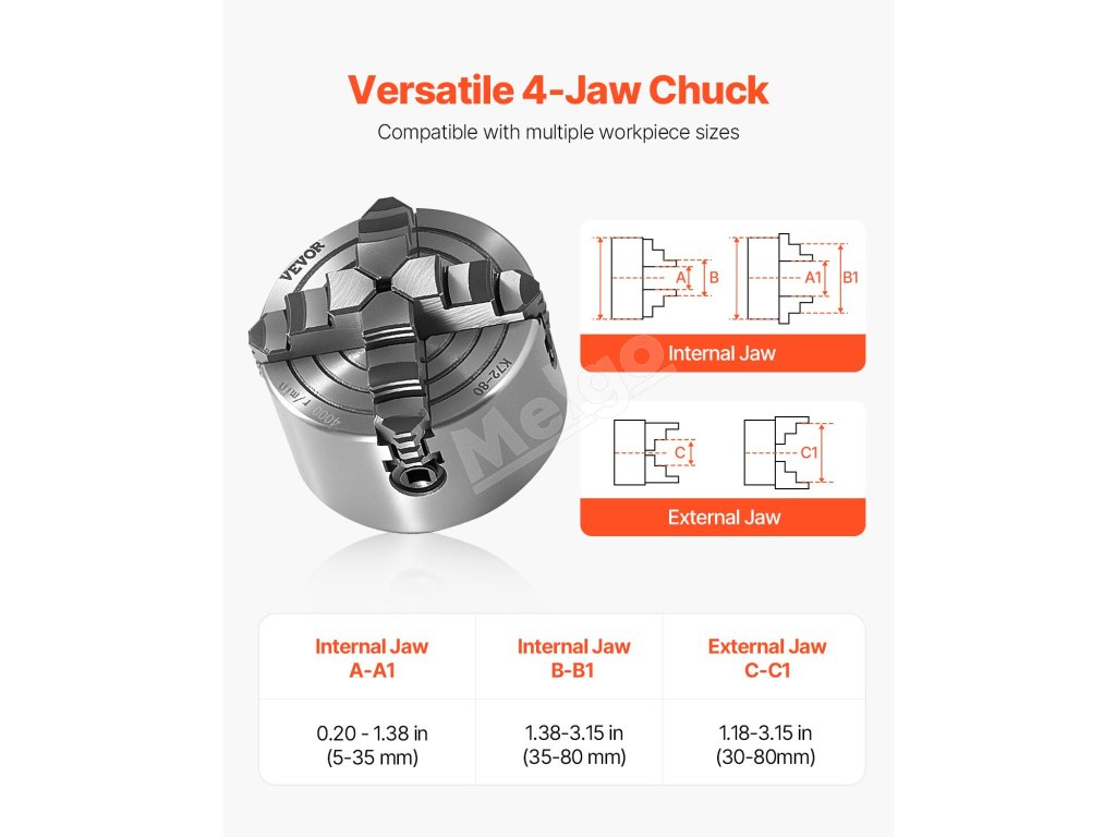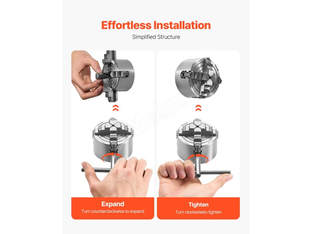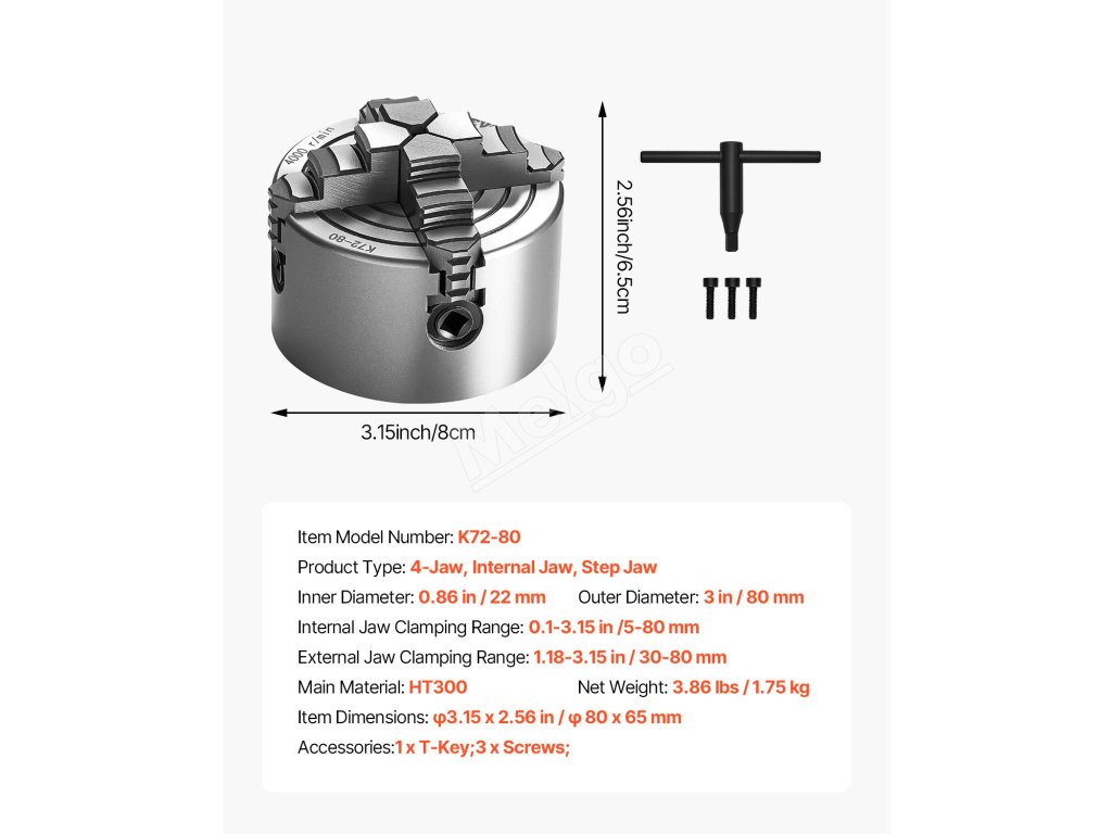 Vyrobené z prvotriednej liatiny HT300, tvrdosť čeľustí ≥53 HRC pre dlhotrvajúcu životnosť a odolnosť proti korózii. Sústružnícke skľučovadlo poskytuje vysoko presné upínanie bez kalibrácie. Vďaka vnútornému priemeru 0,86 palca a vonkajšiemu priemeru 3 palce ľahko zvládne upínanie v rozsahu od 0,1 palca do 3,15 palca.