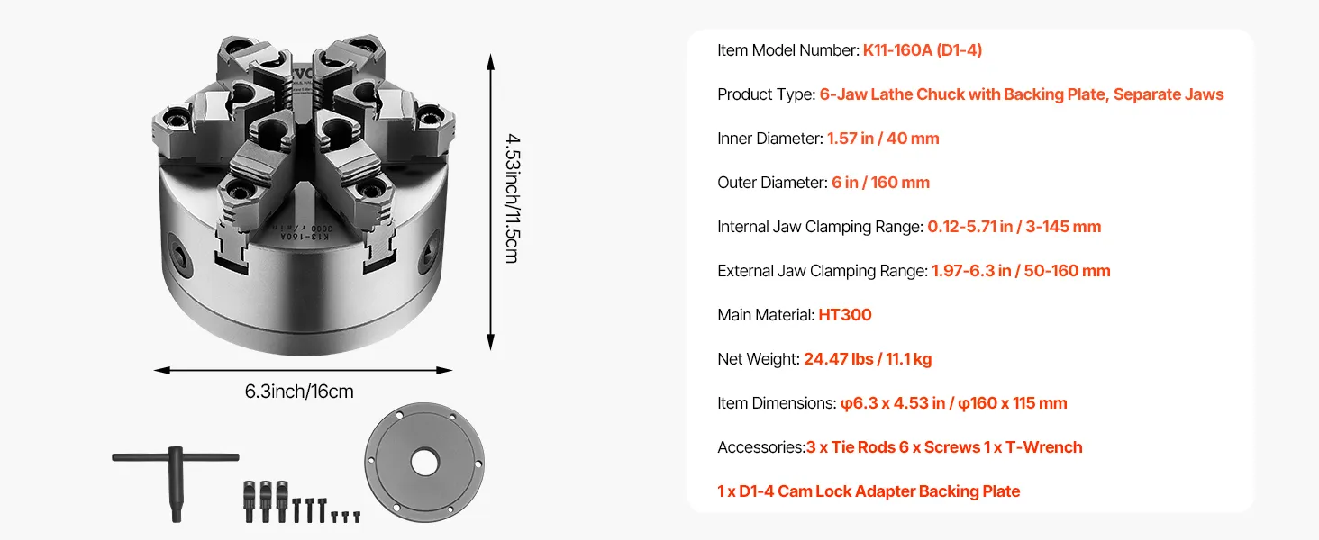 Naše sústružnícke skľučovadlo s podkladovou doskou dosahuje rýchlejšie a stabilnejšie pripojenie stroja. Vyrobené z prvotriednej liatiny HT300, tvrdosť čeľustí ≥53 HRC pre výnimočnú odolnosť. Samocentrovacia konštrukcia zaisťuje vysoko presné upnutie v rozsahu od 0,12 do 5,71 palca s vnútorným priemerom 1,57 palca a vonkajším priemerom 6 palcov.