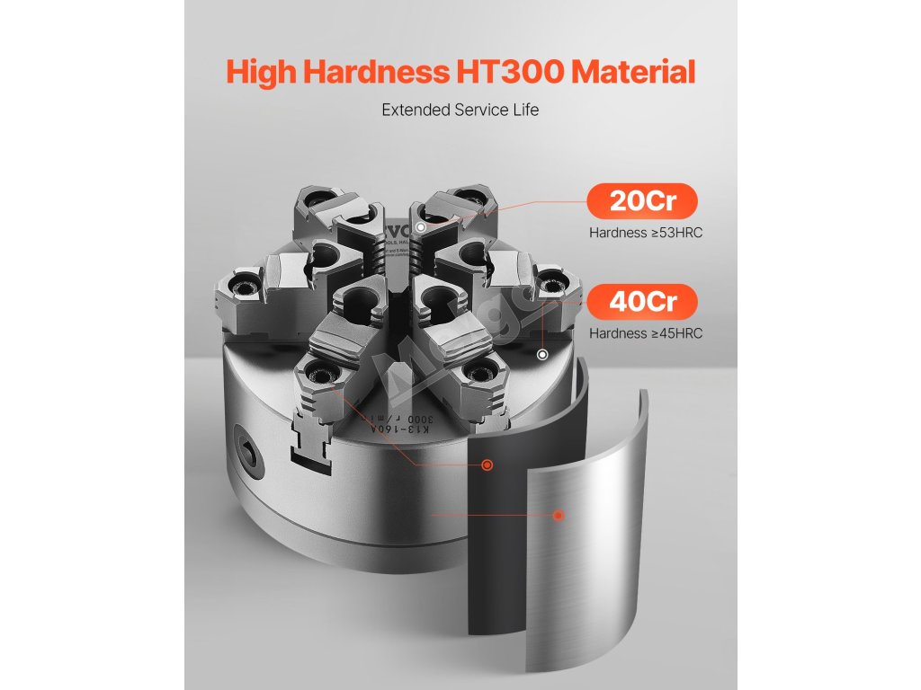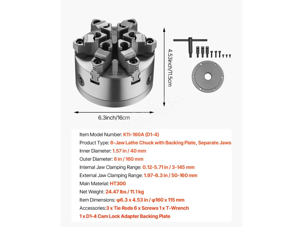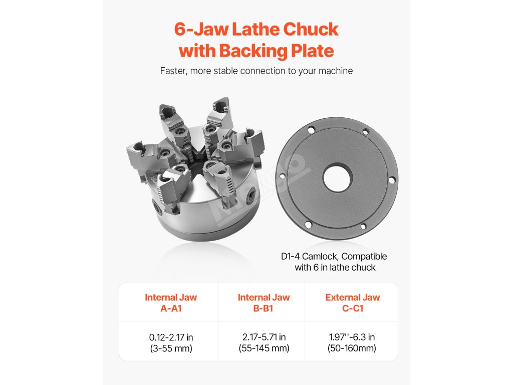 Naše sústružnícke skľučovadlo s podkladovou doskou dosahuje rýchlejšie a stabilnejšie pripojenie stroja. Vyrobené z prvotriednej liatiny HT300, tvrdosť čeľustí ≥53 HRC pre výnimočnú odolnosť. Samocentrovacia konštrukcia zaisťuje vysoko presné upnutie v rozsahu od 0,12 do 5,71 palca s vnútorným priemerom 1,57 palca a vonkajším priemerom 6 palcov.