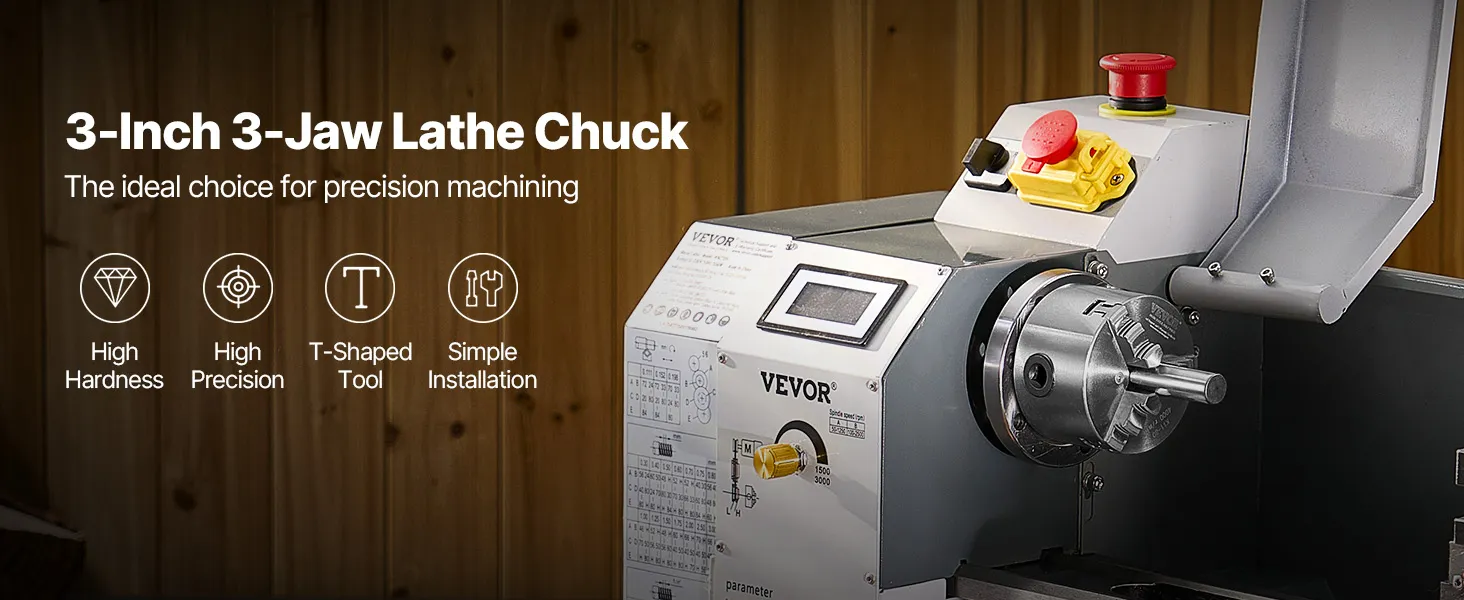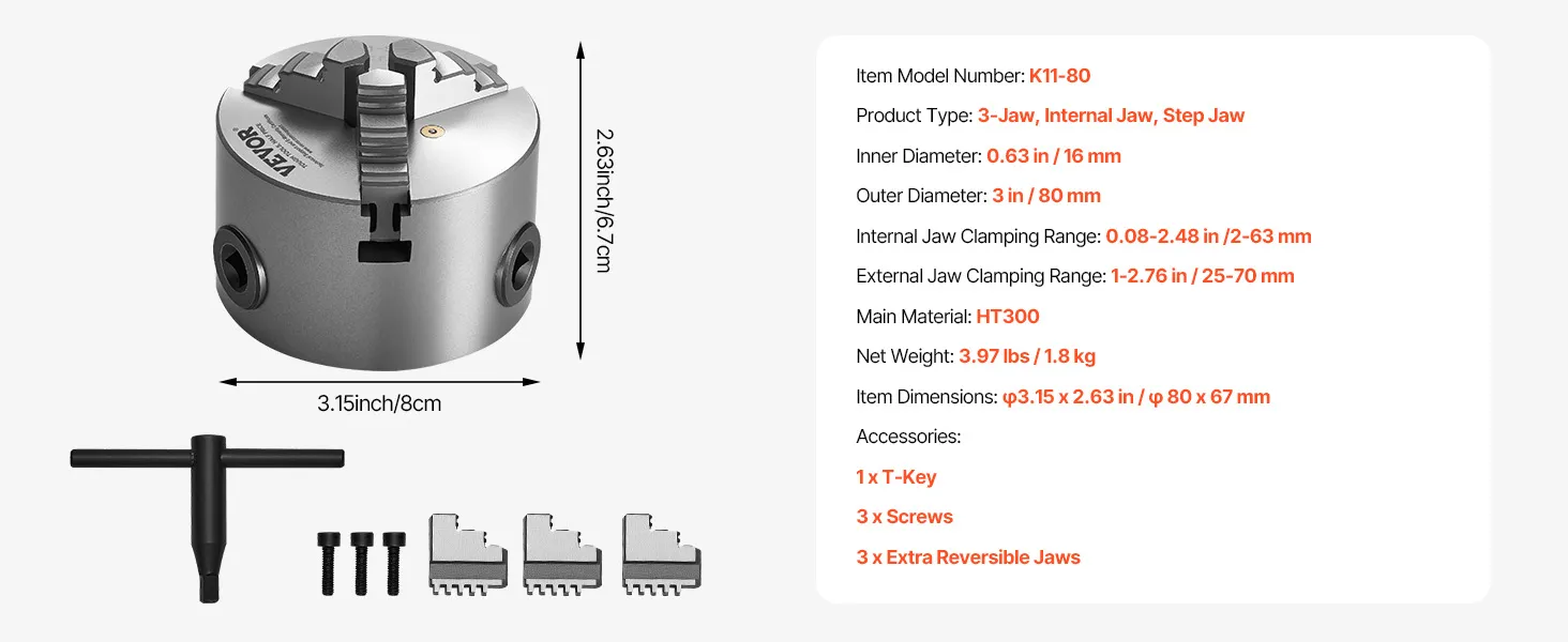Vyrobené z prvotriednej liatiny HT300, tvrdosť čeľustí ≥53 HRC pre dlhotrvajúcu životnosť a odolnosť proti korózii. Samocentrovacie sústružnícke skľučovadlo poskytuje vysoko presné upnutie bez kalibrácie. Vďaka vnútornému priemeru 0,63 palca a vonkajšiemu priemeru 3 palce ľahko zvládne upínanie v rozsahu od 0,08 palca do 2,48 palca.